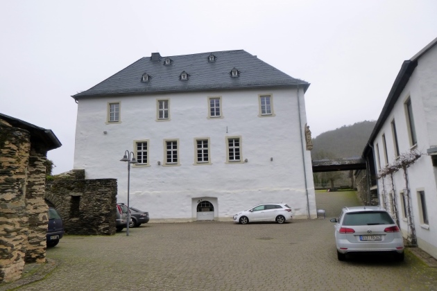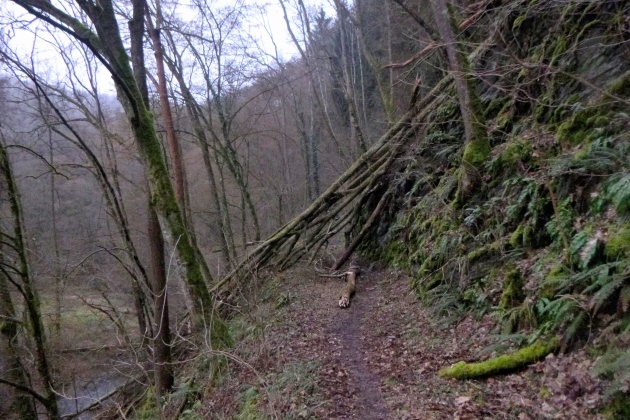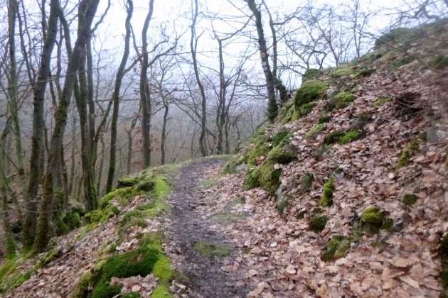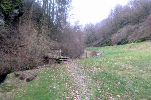 Ein wenig laufen wir noch flach durch Marienfels, dann dem Mühlbach entlang bis Burg Nassau. Das Tal ist sehr angenehm zu belaufen, die Wege sind gut, nur an einigen Stellen geht’s mächtig steil hoch, manchmal über rutschigen Fels. Drahtseile sorgen für Sicherheit, also keine Sorge. Was es nicht gibt, sind Schilder oder Pfeile. Ohne Kenntnis der Strecke brauchts ein GPS-Teil. So mancher kleine Umweg kommt da schon zusammen.