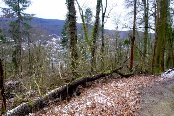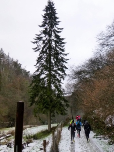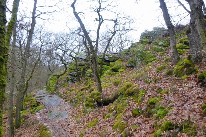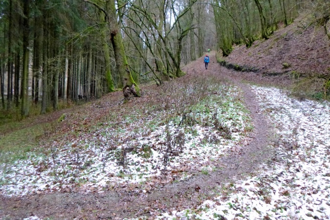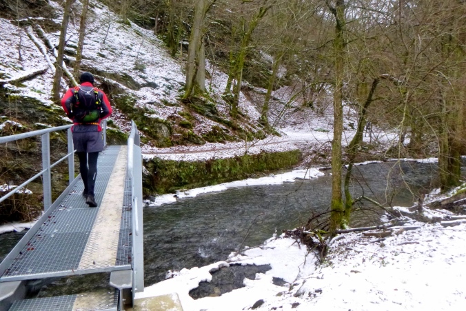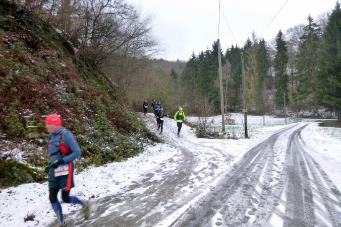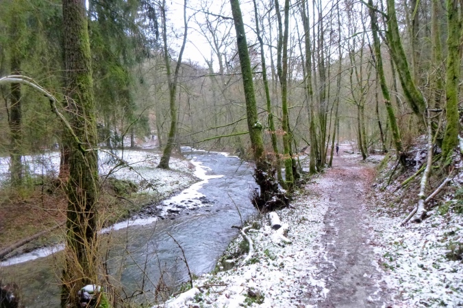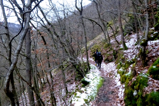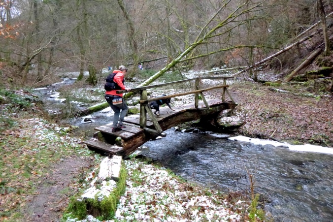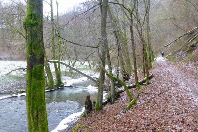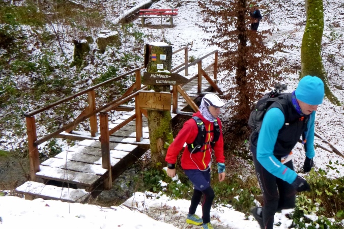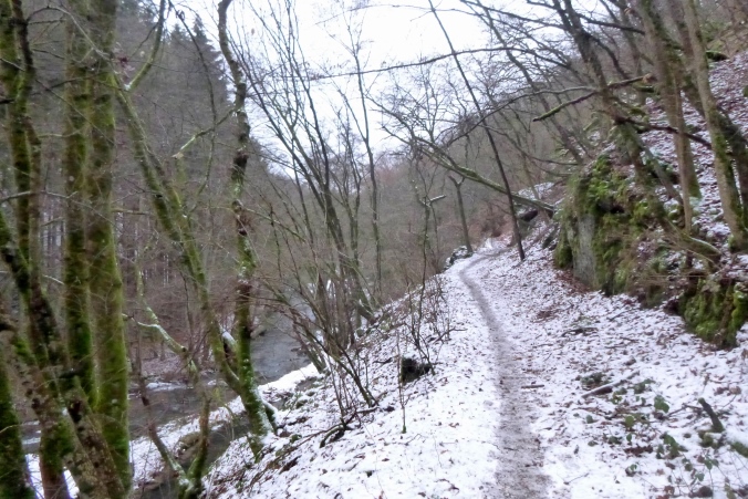 Im weiten Talgrund traben wir nach Marienfels, auch hier römische Reste. Der Kleinbahn-Damm ist kaum als solcher zu erkennen, der Limes auch nicht. Eigentlich, denn der Spitzgraben ist noch da. Kaum auf germanischem Gebiet, fängt der schmale, wilde Trail an. Seltsamer Zufall? Der Mühlbach hat ordentlich Wasser. Mal sind wir direkt daneben, mal ganz hoch in den Klippen. Gut, dass das hier nicht vereist ist. So ein paar Stellen wären dann wohl sehr knifflig geworden. Aber es läuft sich einfach wunderbar, fast von selbst.