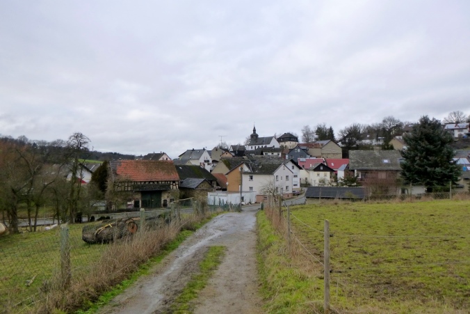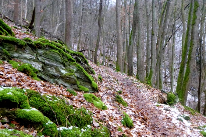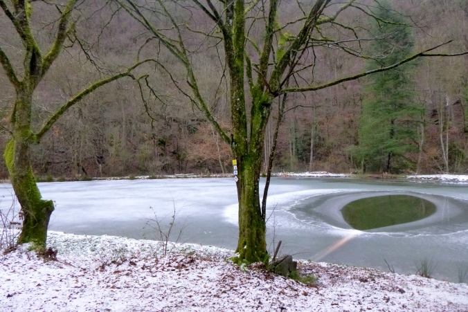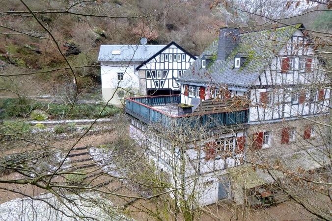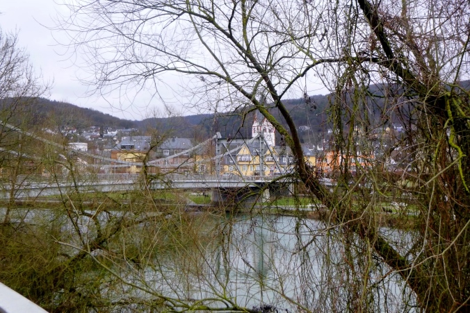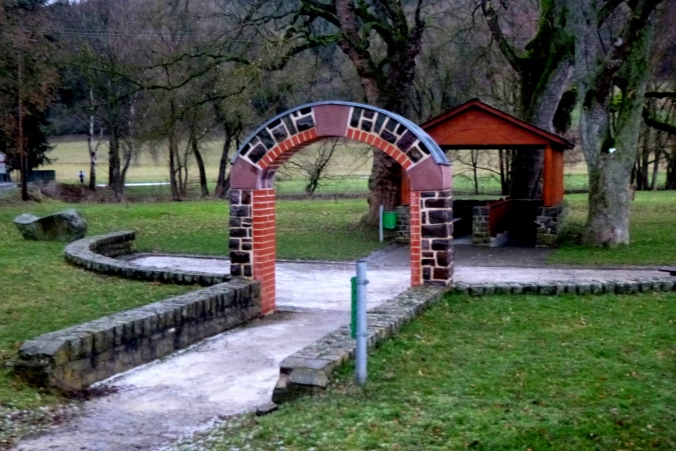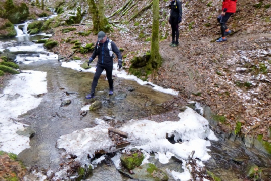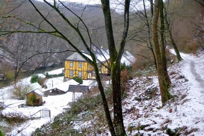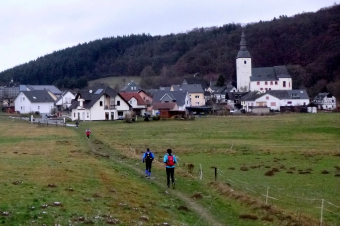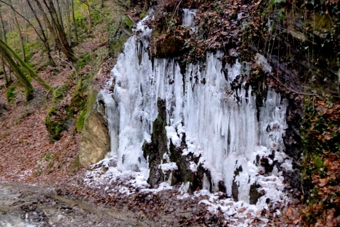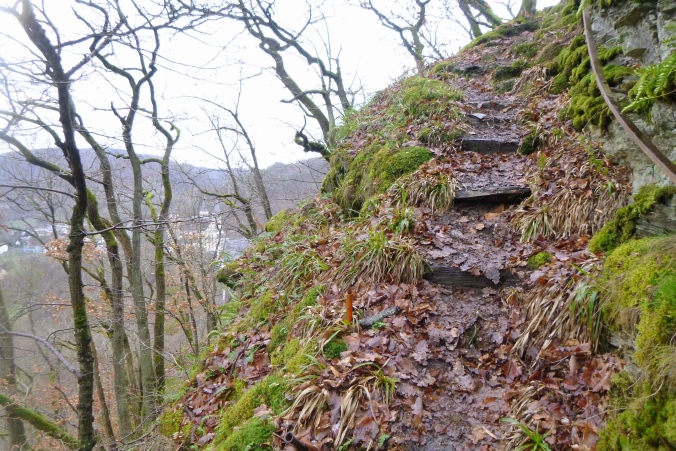 Im weiten Talgrund traben wir nach Marienfels, auch hier römische Reste. Der Kleinbahn-Damm ist kaum als solcher zu erkennen, der Limes auch nicht. Eigentlich, denn der Spitzgraben ist noch da. Kaum auf germanischem Gebiet, fängt der schmale, wilde Trail an. Seltsamer Zufall? Der Mühlbach hat ordentlich Wasser. Mal sind wir direkt daneben, mal ganz hoch in den Klippen. Gut, dass das hier nicht vereist ist. So ein paar Stellen wären dann wohl sehr knifflig geworden. Aber es läuft sich einfach wunderbar, fast von selbst.