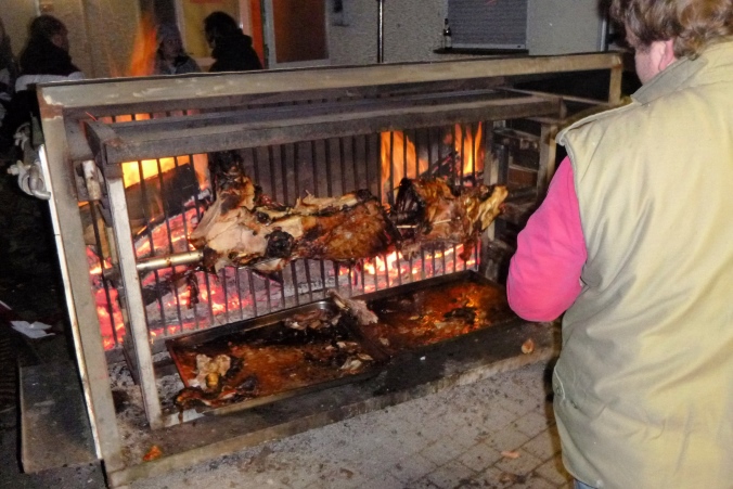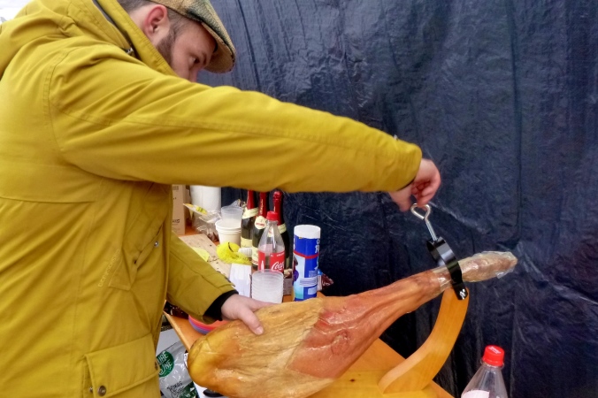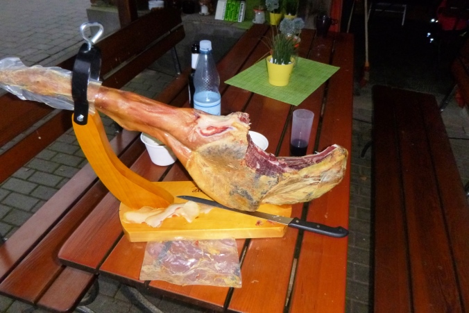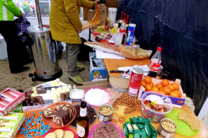 Aber irgendwie schaffen es alle. Die Burg sieht man ja von weitem. Aber da hoch? Puuh, die Rampe hat es schwer in sich. Dafür steht oben Axels VP mit allem, was es nur gibt. Das Beste: Serranoschinken, frisch aufgeschnitten, und Schokosmarties, exklusiv mit dem Veranstaltungs-Logo. Und auch was Warmes ist im Angebot: Brühe und Jagertee, aah- sowas tut not.