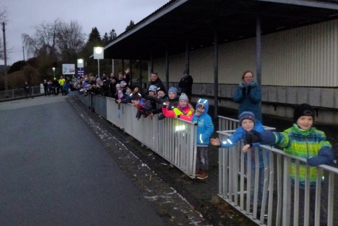 Pünktlich traben wir aus der warmen Turnhalle ab, gleich links, und im Uhrzeigersinn auf die Strecke. Zunächst noch im zivilisierten römischen Gebiet: wir sind westlich des Limes (etwa entlang der Holzhausener Hauptstraße). Gute Forstwege, etwas Schotter, immer schön breit. Wir müssen uns ja noch nach Tempo sortieren. Und in Miehlen, da stehen sie, die Kinder, die uns ein Gedicht geschrieben haben. Solche Fans muss man einfach liebhaben. Ganz toll!