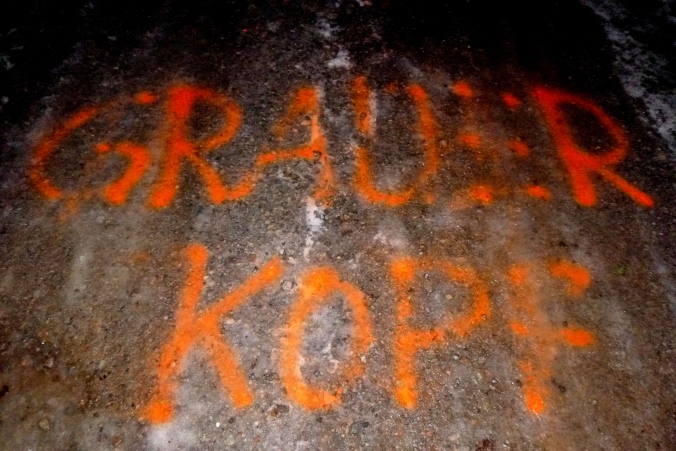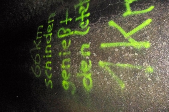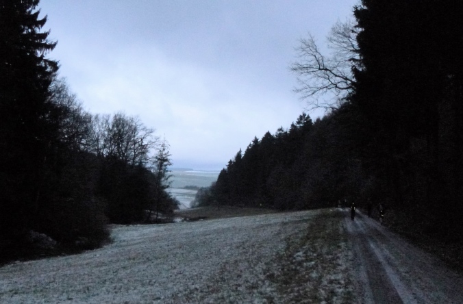 Nach dem Freibad (beheizt, aber der Bademeister hat frei) beginnt der grausame Aufstieg zum Grauen Kopf. Stetig nur hoch. Langsam sinkt die Dämmerung herab, aber der Schnee beleuchtet noch alles gut. Die schwarzen Mauern des Römerkastells sind direkt am Weg. Ein Riesentrumm, und nicht weit davon die römische Badeanstalt. Wir sind wieder in der Zivilisation! Erst klingt es wie Meeresrauschen, Nordsee bei Flut und Starkwind, aber es sind die Quirle vom Windpark hier oben. Was für ein Getöse, pausenlos. Der Gipfel wird umrundet und am Kastell begegnen wir uns auf einem kurzen Stück. So, oben am Gipfel noch die Leseprobe einsammeln und mit Stirnlampe flott runter.
