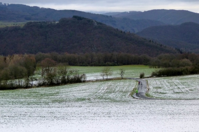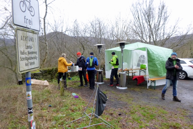 Ein wenig Radweg noch, links unten die Lahn mit der großen Schleuse. Dann kommt der checkpoint am Kloster mit Glühwein- für die Motivation. Denn es gibt eine kleine Schleife, ungefähr 2 km mit 150 hm. Da sollte man schon gute Laune für haben. Hat man fertig geschleift, sollte jeder noch mal kräftig zulangen. Nächster Halt ist in gut 20 km.