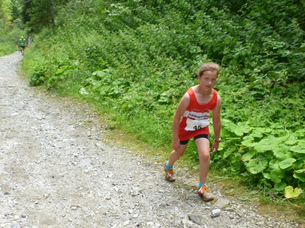Bei Kilometer drei sind wir am Zusammenfluss zweier Bergbäche, den wir über ein neues Brückchen überqueren. Jetzt geht es entlang des Schlickerbachs steil bergauf. Kurzfristig auf einem Forstweg und später auf Wanderwegen. Hier überholen wir (gehend) die zehnjährige “Lokalmatadorin“ Maria, die in ihrer Altersklasse beim „kurzen Lauf“ Erste wird – drei Minuten nach uns.