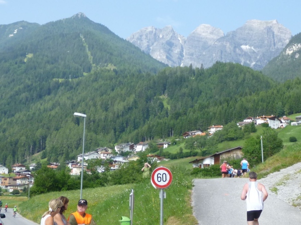Nach dem pünktlichen Startschuss folgt eine einen Kilometer lange Dorfrunde zum Warmwerden, wenn man das bei dieser Affenhitze so sagen kann. Für mich auch wieder schön, weil wir an den Gleisen der Bergstraßenbahn nach Innsbruck entlanglaufen. Mit den schicken roten Wagen kommt man in einer Stunde bis ins Zentrum der Olympiastadt. Danach beginnt mit dem Telfeser Wiesenweg schon der Anstieg. Sehr viele Zuschauer feuern uns hier an. Es ist Hochsaison im Stubaital, das von vielen Holländern, Belgiern, Franzosen, Engländern und Italienern besucht wird. Entsprechend international ist auch das Teilnehmerfeld.