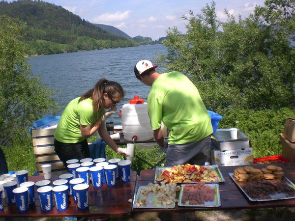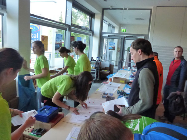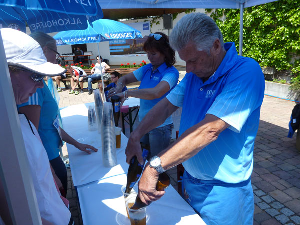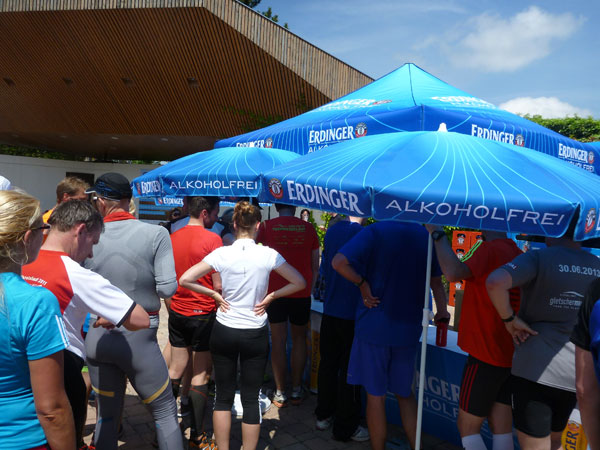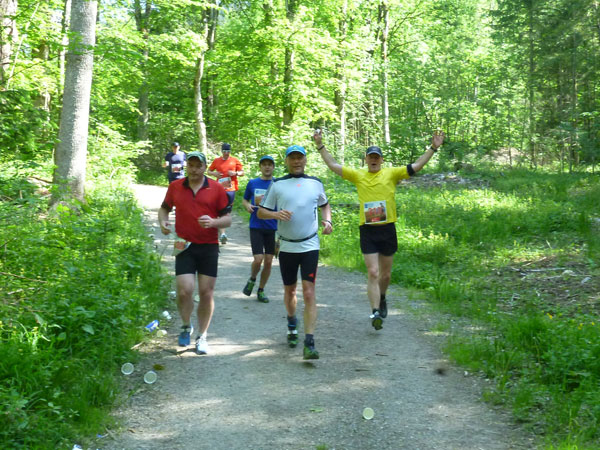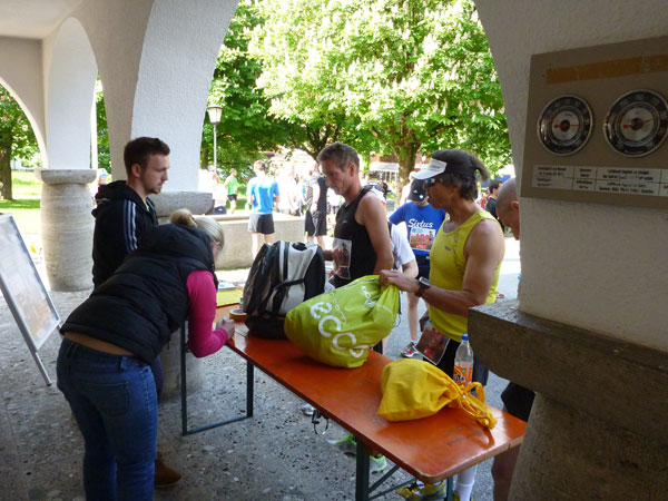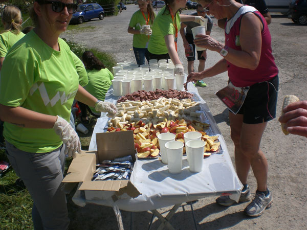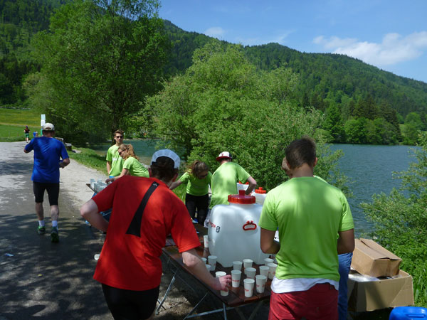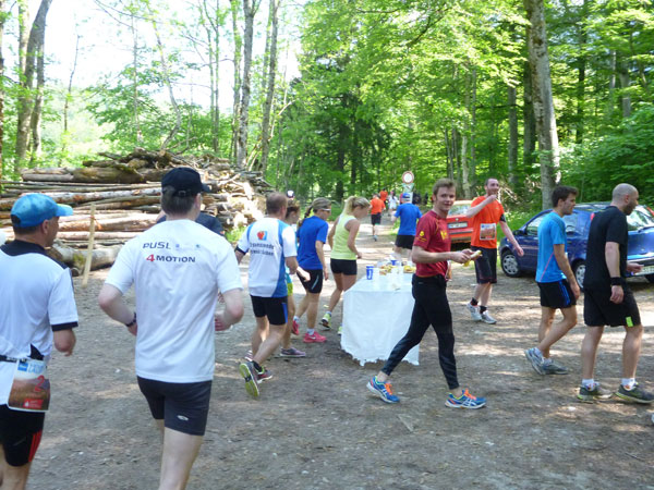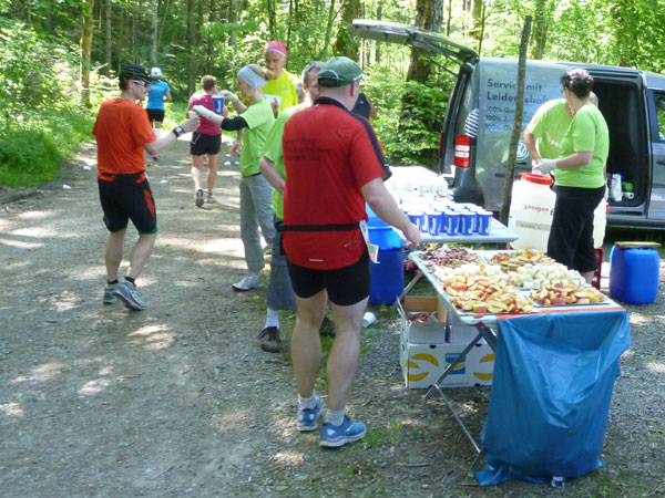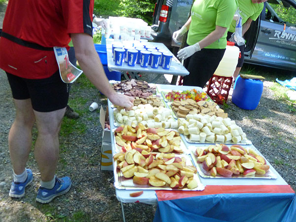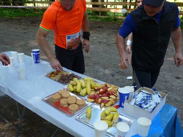 Aber alles geht vorbei und zur Belohnung kann man an einer reichlich gedeckten Labe (km 7), verloren gegangene Energie und Flüssigkeit nachtanken. Cola, Wasser, Iso, Energyriegel und –gels, Schokolade, Gummibärchen, Kekse und natürlich auch was Gesundes, wie Äpfel und Bananen werden angeboten.