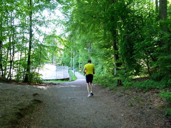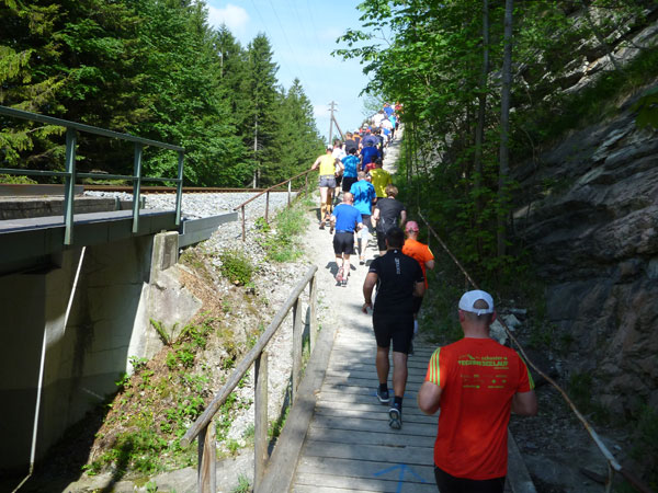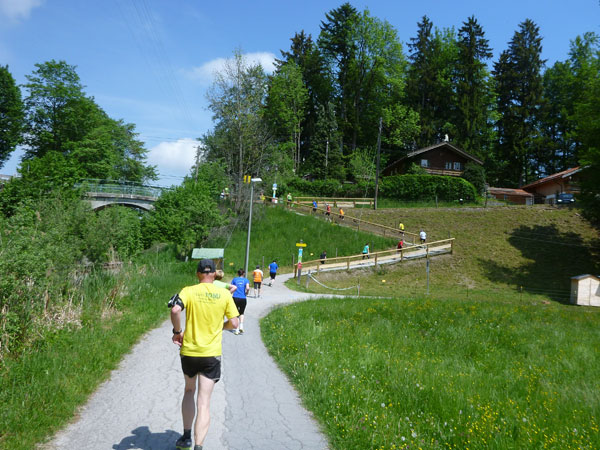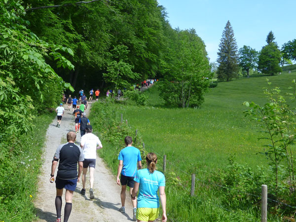 Spürbar ansteigend geht es weiter. Die größte Herausforderung der Strecke erwartet uns zwischen km 4,5 und 5,5. 100 Höhenmeter beinhaltet der Abschnitt, was viele in den Gehschritt verfallen lässt. Wer hier gut drauf ist, kann viele Plätze gut machen. Mir fehlt heuer noch Bergtraining, daher gibt es kein Pardon. Die Sache ist machbar und stellt für Bergfreunde auch kein großes Problem dar. Für jemanden, der in erster Linie auf flachen Strecken unterwegs ist, ist das allerdings schon sehr herausfordernd.