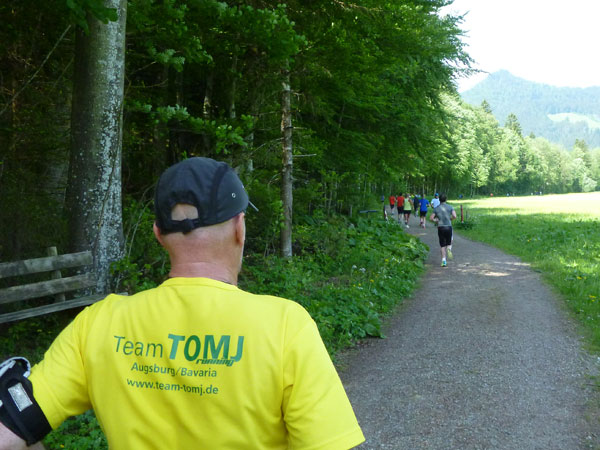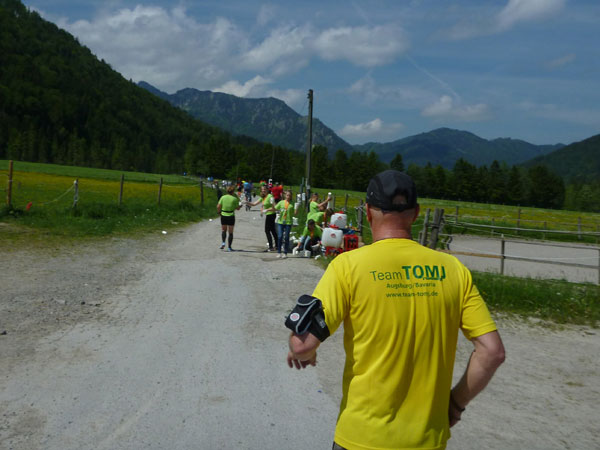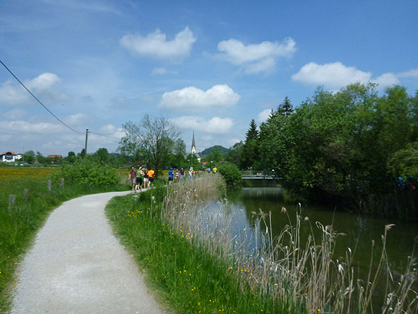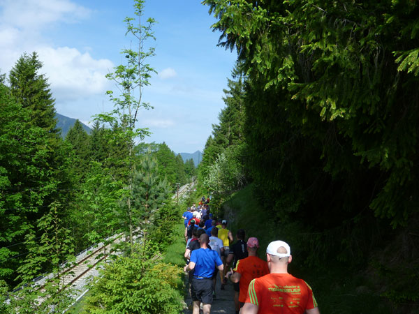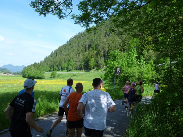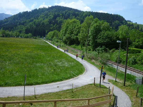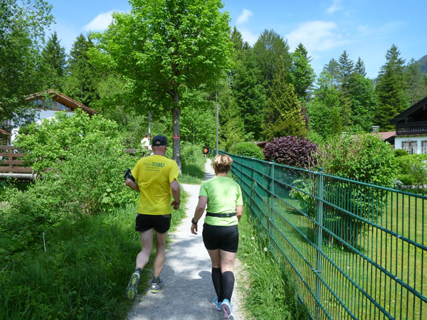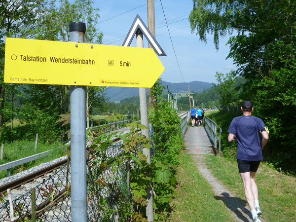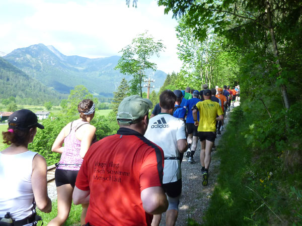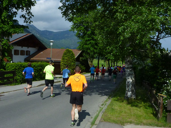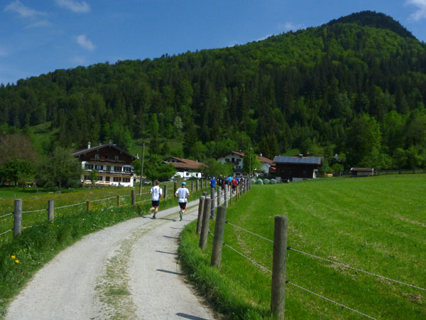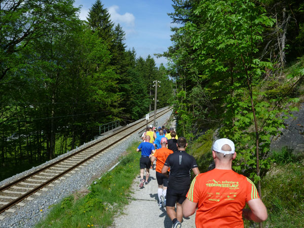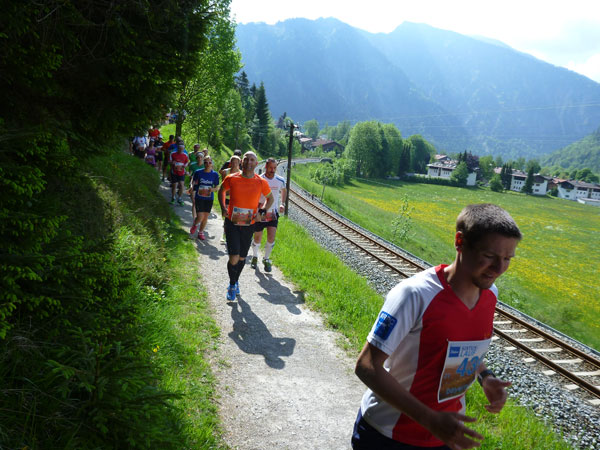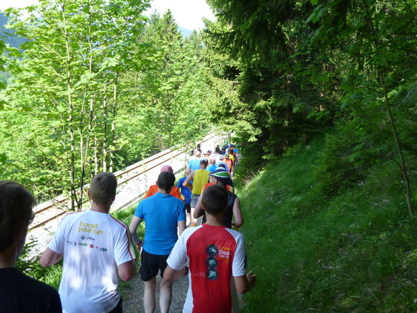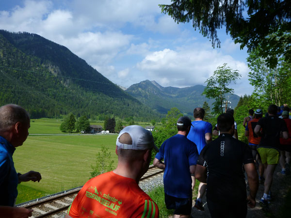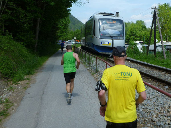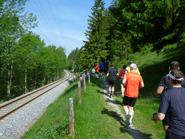 Mit leichter Verspätung geht es los. Die ersten 800 Meter laufen wir auf der Schlierseer Straße bis ans Ortsende und an die Bahnlinie. Ein schöner Trail führt auf den folgenden 3,5 km in einem ständigen, leichten Auf und Ab meist direkt an den Bahngleisen entlang. Die erste Getränke- und Verpflegungsstation erwartet uns nach 5 km.