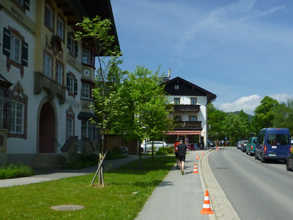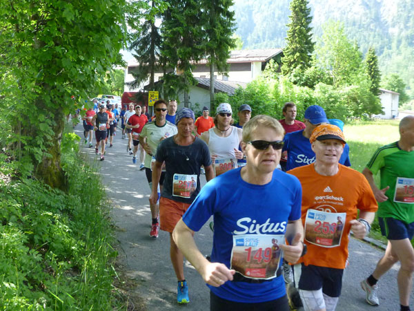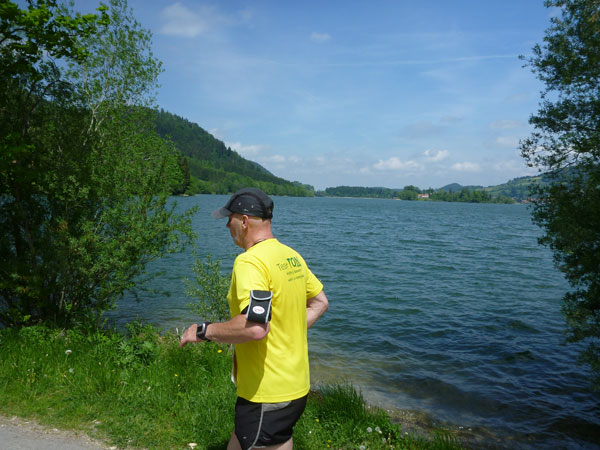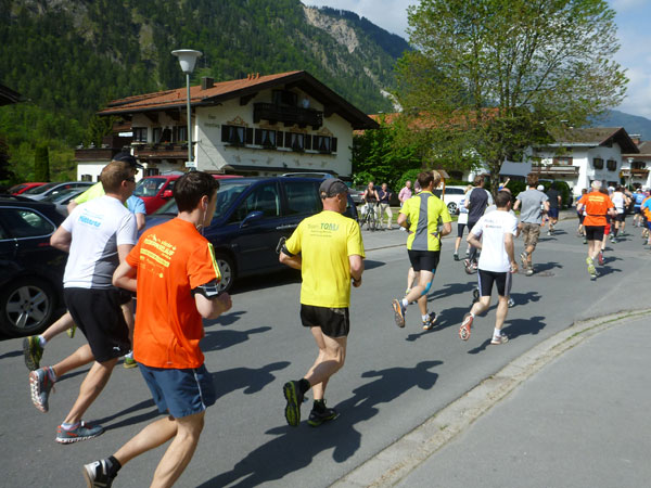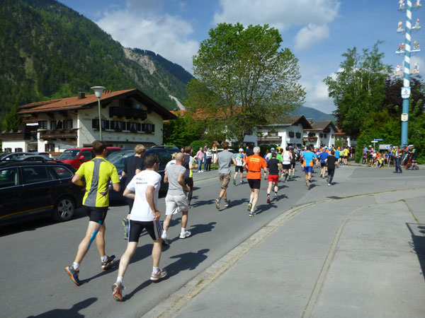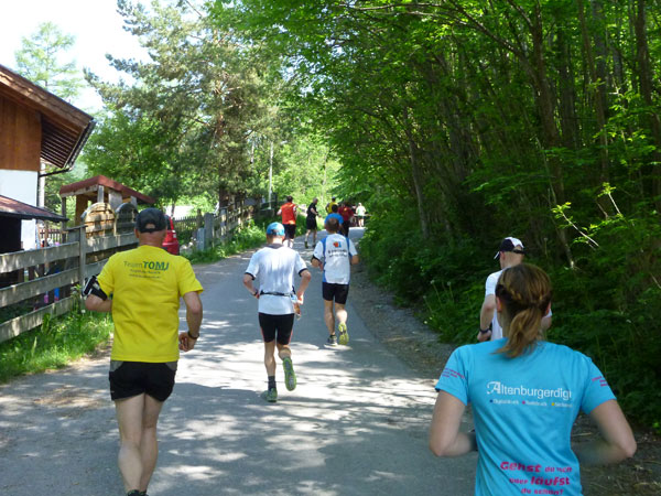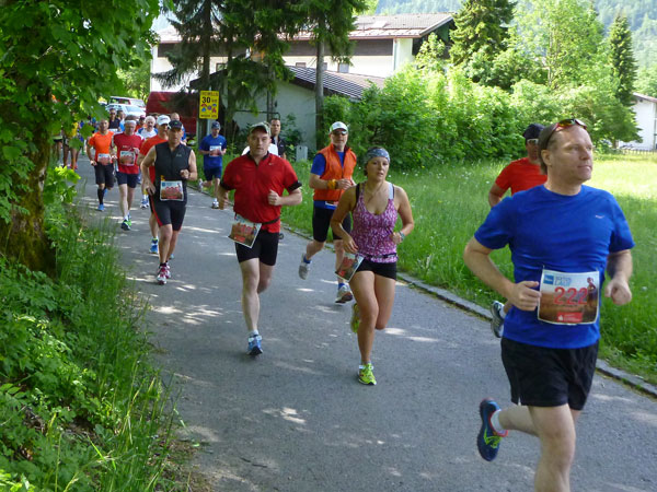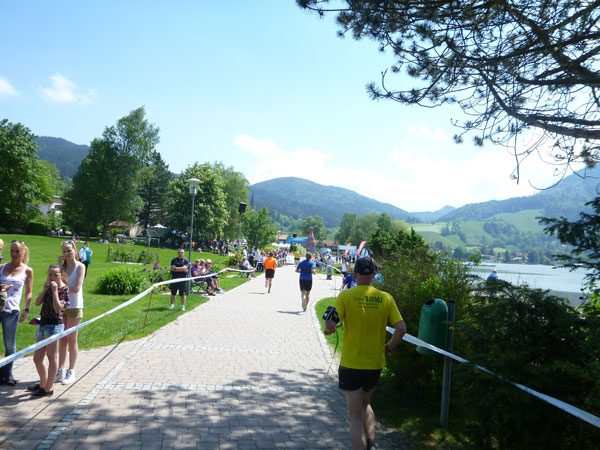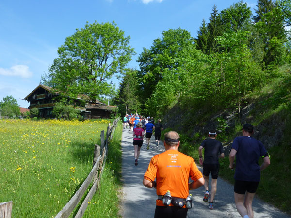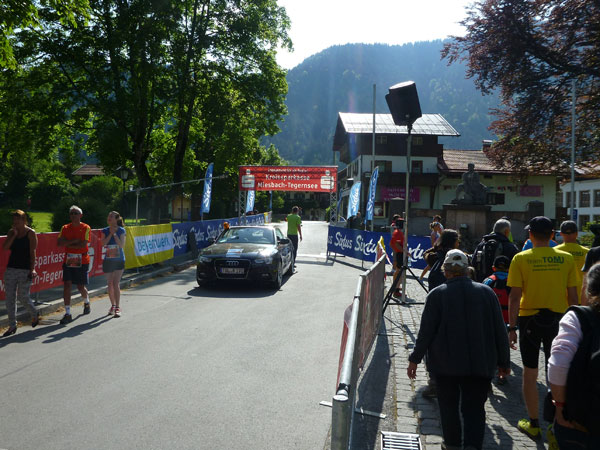 Ich warte hier ja immer noch auf den richtigen Anstieg zum Lauf-Ende hin. Charly meint, es kommt keiner mehr und da hat er natürlich Recht. Ich habe mir das Höhenprofil falsch eingeprägt. Auf der Streckenkarte, natürlich identisch mit einer Landkarte, liegt unser Ziel Schliersee links und der Startort Bayrischzell rechts. Das Höhenprofil beginnt aber immer links. Ich habe das verwechselt. Den Berg haben wir also schon hinter uns. Anfängerfehler. Aber eigentlich auch schade, finde ich. Ich hätte mich gefreut, wenn man uns mal richtig den Berg hoch gescheucht hätte, vielleicht mit Blick hinunter auf den Schliersee. Das werden zeitenorientierte Straßenläufer jetzt natürlich nicht nachvollziehen können.