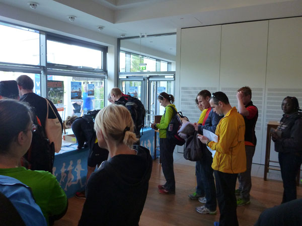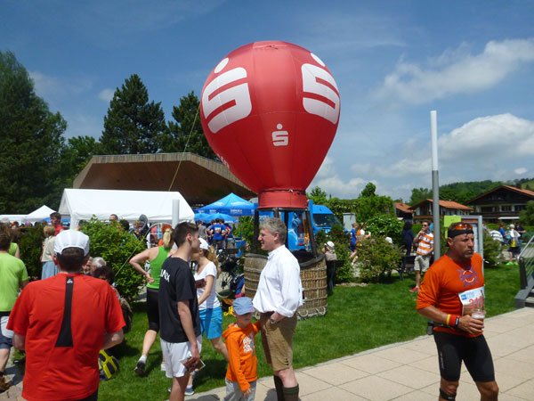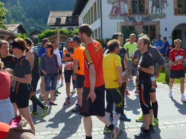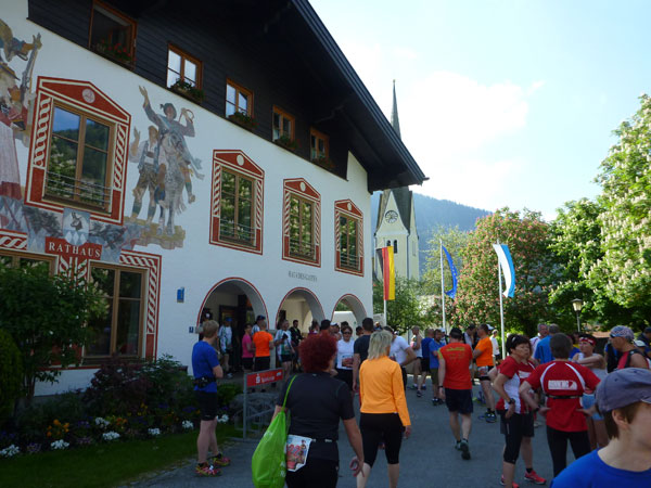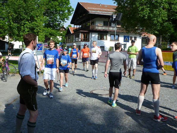 Vom Bahnhof bis zum Startplatz ist nur ein kurzer, fünfminütiger Fußmarsch nötig. Wer sein Gepäck nicht schon in Schliersee abgegeben hat, der kann es hier noch nachholen, vor dem Rathaus ist ein Stand aufgebaut, von wo alles zurück in die vitalwelt schliersee transportiert wird. Heute ist herrliches Wetter und es herrschen bereits angenehme Temperaturen, so haben nur die wenigsten noch Wärmebekleidung mit hierher genommen.