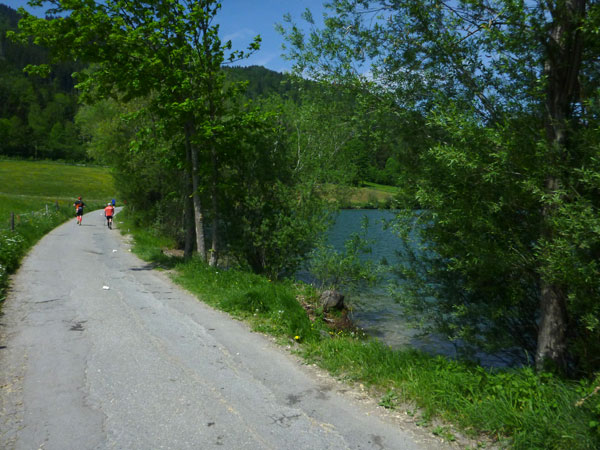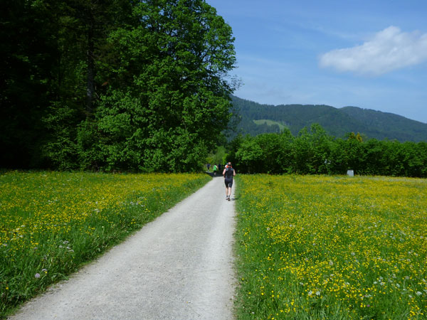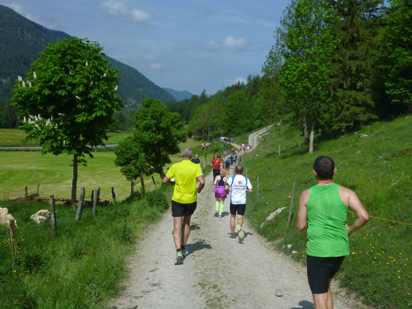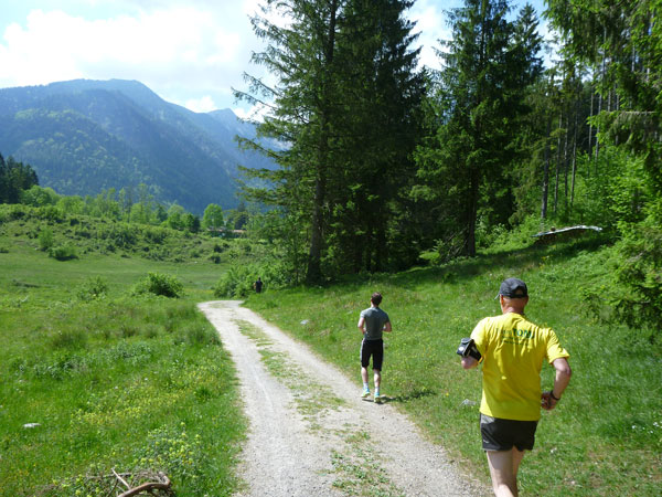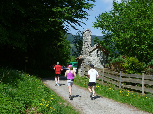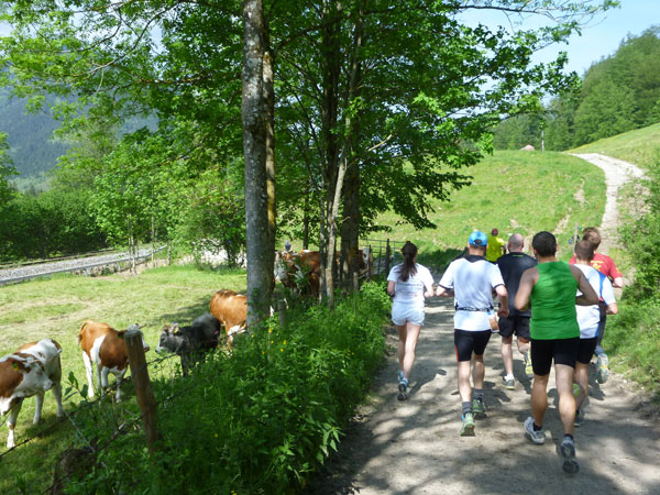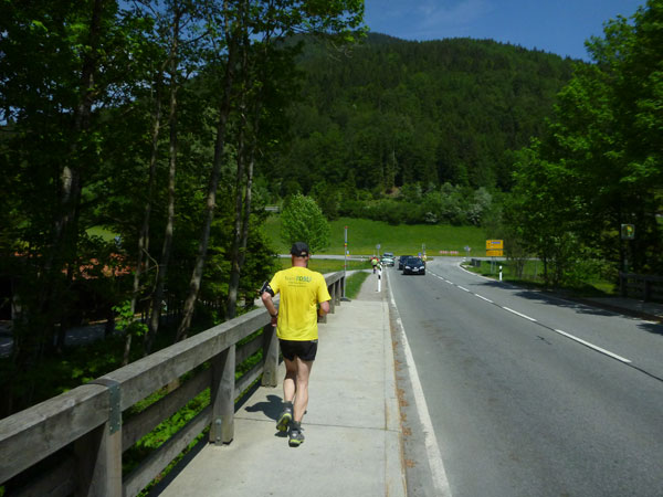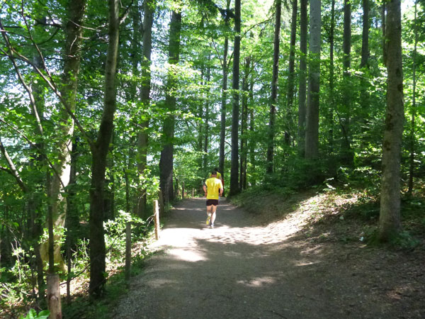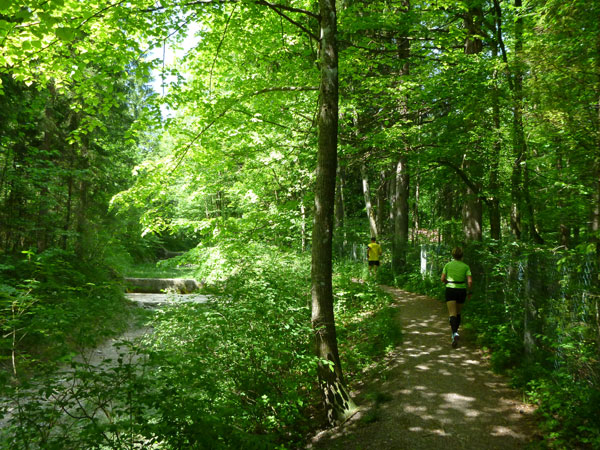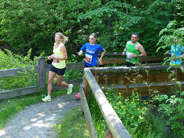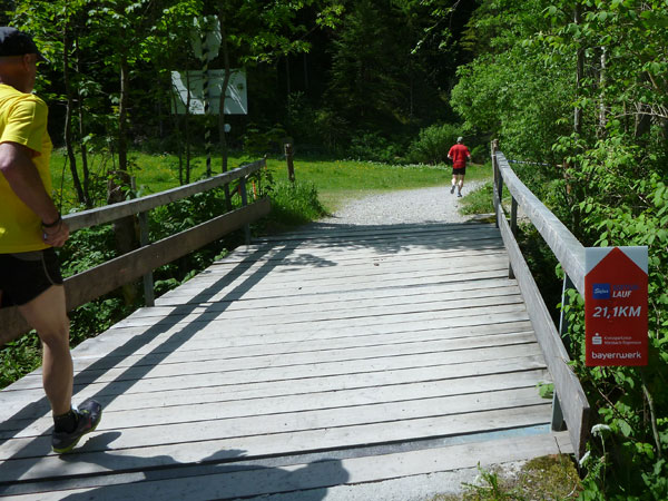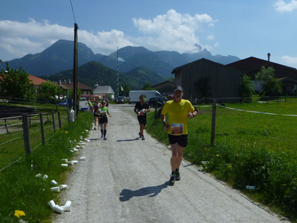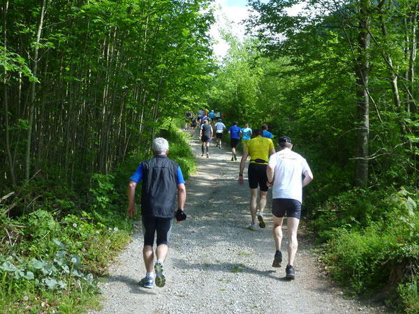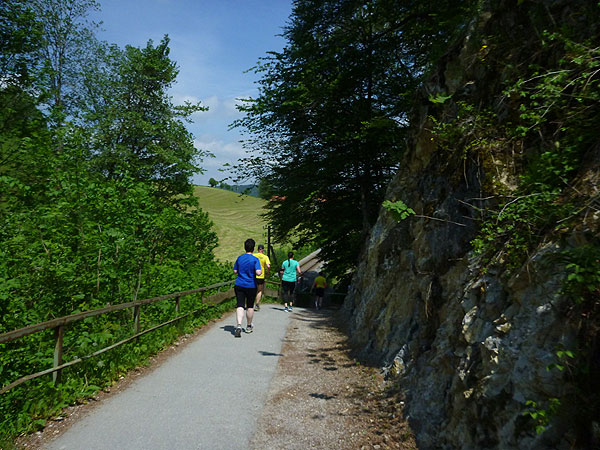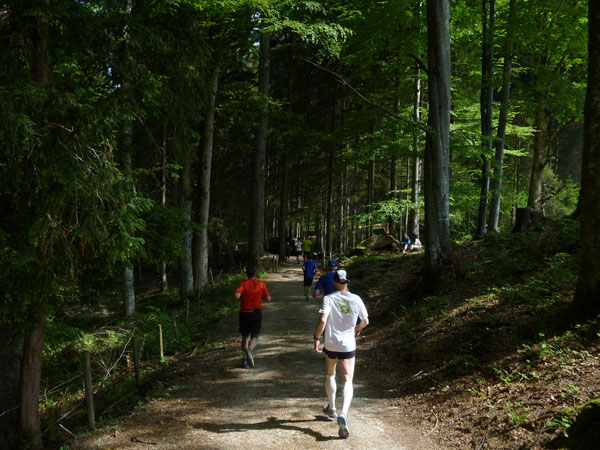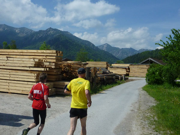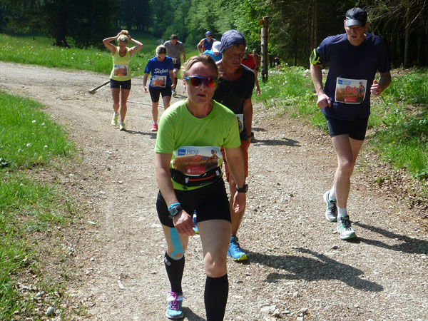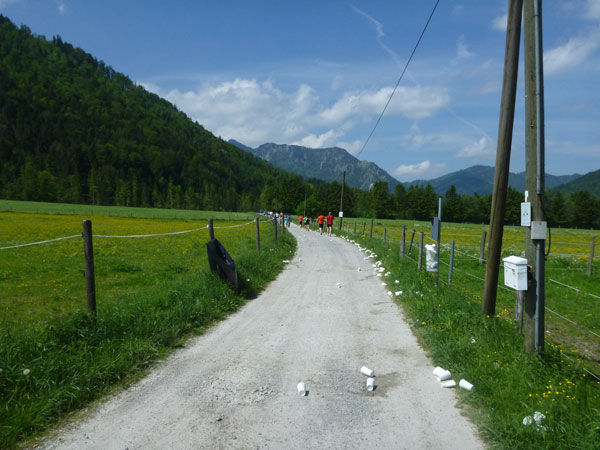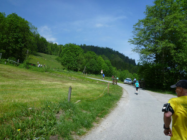 Nach einer weiteren Getränkestation sind 10 km absolviert und auch der tiefste Punkt der Strecke erreicht. Tendenziell führt die zweite Streckenhälfte immer leicht aufwärts bis ins Ziel. Bei Aurach (km 12) überqueren wir die Verbindungsstraße Schliersee-Bayrischzell. Mittlerweile ist es schon sehr warm geworden, die nächste VP sorgt für einen ausgeglichenen Flüssigkeitshaushalt. Weiter geht es in einen bewaldeten Abschnitt auf einem Forstweg.