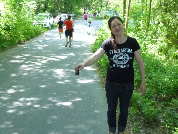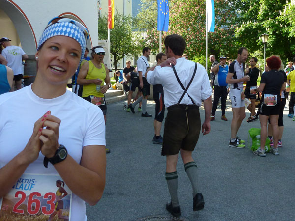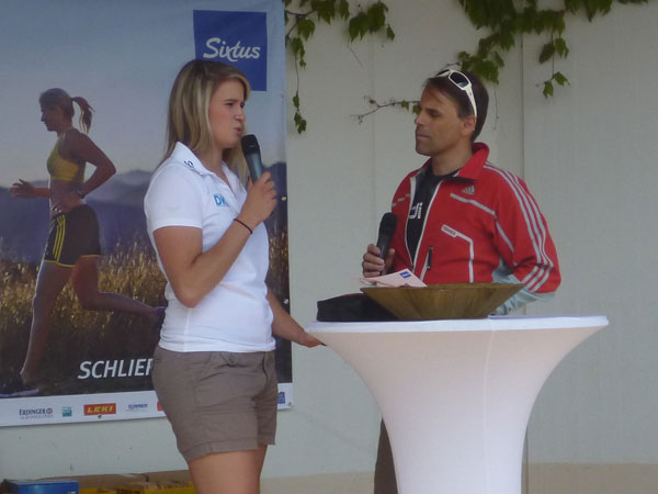 Letzte Tipps für das Rennen bekommen wir per Micro von Ingalena Heuck, ehemalige Deutsche Meisterin im Halbmarathon. Aufgrund anhaltender Fußprobleme hat sie sich im Vorjahr aus dem Leistungssport zurückgezogen, ist aber heute freizeitmäßig auch am Start.