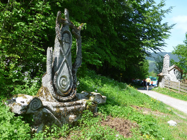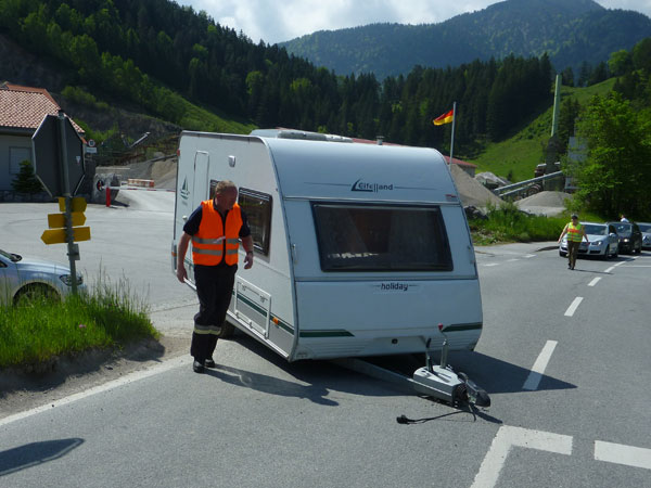 Ein kurzer Abschnitt führt uns über eine befahrene Teerstraße, da heißt es Obacht geben. Gelegentlich werden wir von Autofahrern überholt. Einer verliert beim Abbiegen auf die Hauptstraße bei Sandbichl seinen Wohnwagen und bleibt mitten auf der Straße liegen. Jetzt wird die Wartezeit für die Autofahrer noch länger.