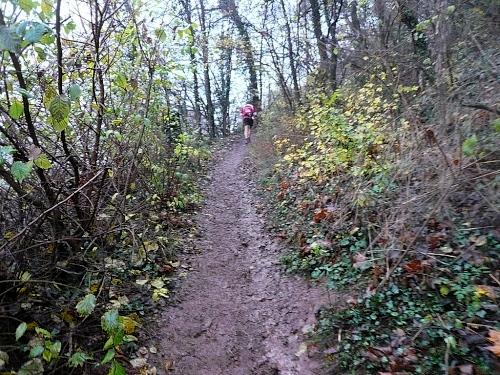 Am Waldrand nach ca. 2,5km biegen wir ab und umrunden auf den nächsten 2,5 km den Adenser Berg. Hier ist es ganz schön rutschig vom nächtlichen Regen und dem permanenten leichten Nieseln heute. Es geht über einen schmalen Trail hinunter zur K 505. Bis 1935 gab es zwischen der Leine und dem Marienberg lediglich einen schmalen Feldweg und zur Überquerung nur eine steinerne Brücke, die jedoch für Fahrzeuge zur Burg gesperrt war. Beim Straßenbau fand man beschriftete Findlinge, die auf die Sachsenschlucht hinwiesen.