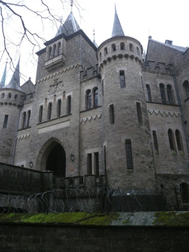 Kurz vor dem 5 Km-Schild sind wir unterhalb vom Märchen- und Traumschloss der Welfen, der Marienburg. Gleich hinter der Kurve beginnt der eigentliche Aufstieg über die Marienbergstraße. Wir nehmen aber den matschigen Trail, der uns in Serpentinen aufwärts führt. Bei der letzten Serpentine erkennt man dann endlich die Silhouette des Schlosses mit seinen verspielten Wach- und Wehrtürmen. Es zählt zu den bedeutendsten neugotischen Baudenkmälern in Deutschland.