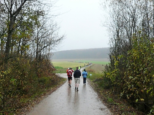 Ein Stück begleite ich Helmut Braun, der auch schon um die 350 Marathons in den Beinen hat. Er ist dafür bekannt, dass er immer als Streckenverpflegung einen Liter Milch und ein trockenes Brötchen bei sich hat. Die in seiner Hand sehe ich, aber wo ist das Brötchen? Er hat es in der Jackentasche und für ein Foto zeigt er es vor. Neben ihm läuft Hans Drexler, alias Schneggi. Er bringt es auf ungefähr 500 Marathons und hat selbst eine Internetseite. Nur ein paar Schritte hinter mir läuft Christine Schroeder, die bei ungefähr 450 Marathons angekommen ist, und Peter Wieneke, der mit seinen 67 Lenzen schon über 1.000 Marathons gesammelt hat. Da komme ich mir mit meinen 132 Läufen wie ein Anfänger vor.
