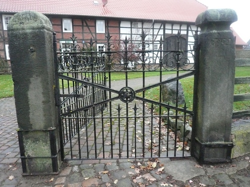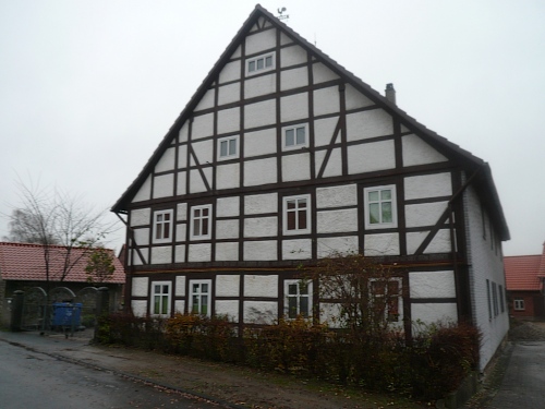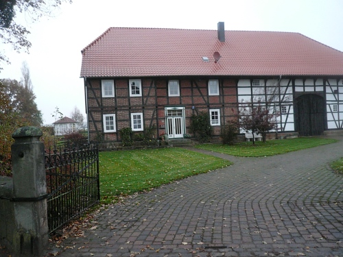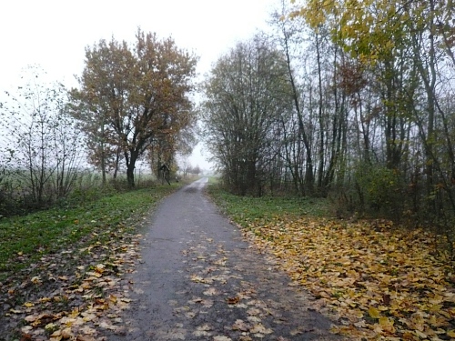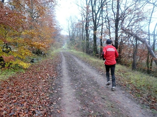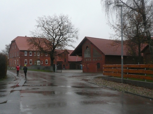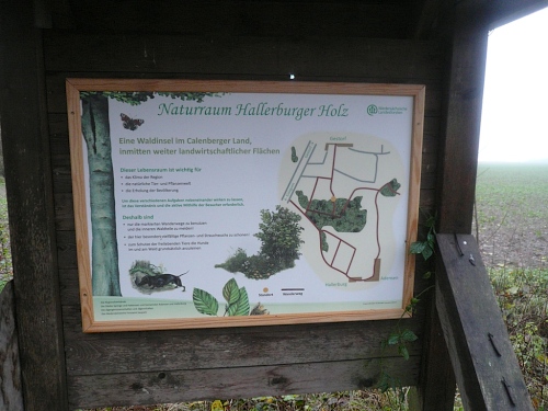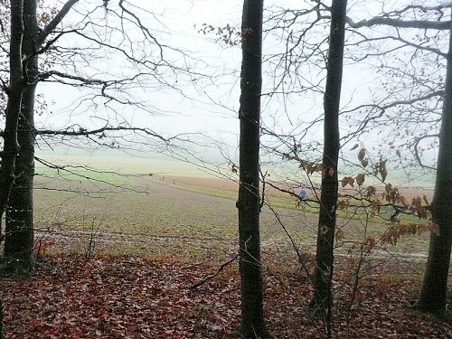 Wir folgen dem Pussenweg bis zu km 13. Die nächsten 7km führen uns über Felder und Wiesen und nur ein paar Waldstücke. So richtig zum Genießen wäre dieser Streckenabschnitt, wäre da nicht der ekelige Nieselregen, der die Wege manchmal ziemlich matschig und rutschig macht. Wer Natur erleben will, ist hier genau richtig. Graugänse kann man sehen, die sich nicht dem Flug gen Süden angeschlossen haben. Infolge der immer milderen Winter und der intensivierten Landwirtschaft finden sie das ganze Jahr über genügend Nahrung. In der Ferne sehe ich Rotwild, das auf den Feldern unterwegs ist. Wir sind im Hallerburger Holz, einem Naturschutzgebiet mit der feuchten Senke des Zigeunerwäldchens. Der Name erinnert daran, dass man in früheren Jahrhunderten Sinti und Roma nicht nach Eldagsen ließ und sich die Menschen dann notgedrungen hier im Wald niederließen.