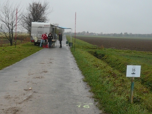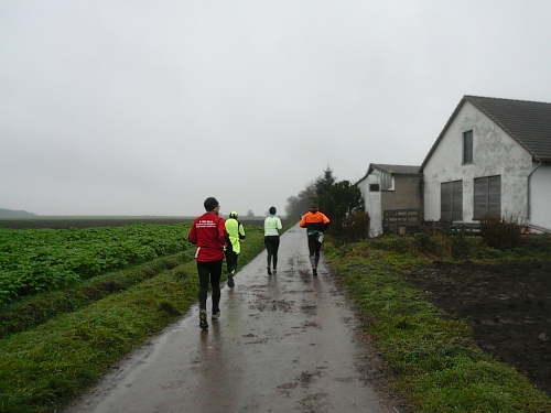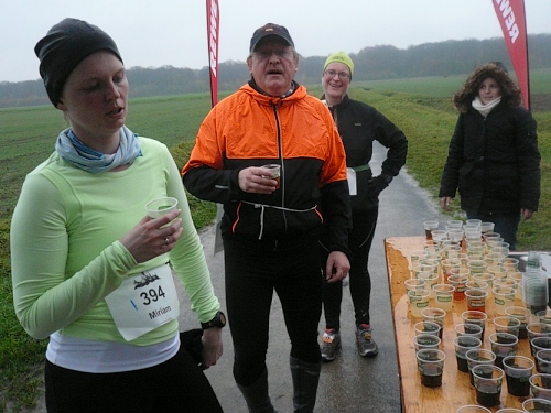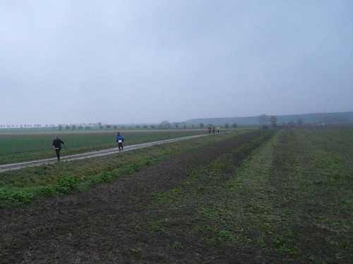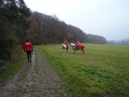 Gut bewacht von einer Reiterstaffel des Roten Kreuzes laufen wir am Schulenburger Berg vorbei und bei km7 um den Adenser Berg, die zum Landschaftsschutzgebiet Calenberger Leinetal gehören. Unterwegs bekommen wir zur Kontrolle eine Markierung auf unsere Startnummer. Die Kontrolleure sind mir einer Kiste Bier versorgt und auf Anfrage bekomme ich davon was ab. Einen Kilometer weiter kommt zum Erholen eine kurze Abwärtsstrecke mit Blicken ins verregnete und leicht nebelige Hallertal und das Calenberger Land.