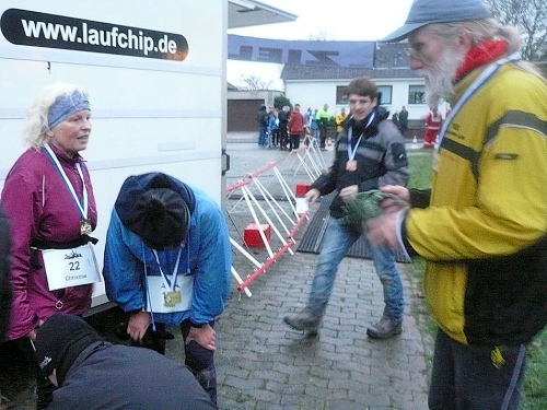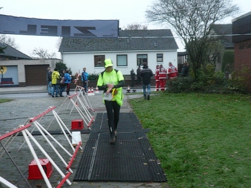 Am Waldrand gibt es wieder Kontrollstriche auf die Startnummer und für mich ein Bier. Weiter geht’s, runter und raus aus dem Wald, über die B3 und zurück zum Start/Zielbereich. Jetzt noch 10,55km. Es geht am Ortsende wieder ins Feld. Um mich rum laufen jetzt Marathonis, die zusammen weit über 4.000 Marathons in den Beinen haben. Manchmal zieht sich die Gruppe auseinander, kommt dann aber wieder zusammen. Jeder will nur unter 6 Stunden bleiben. Dann kommt nach der letzten Matschpartie das km-Schild 20 vor Hallerburg. Das heißt, insgesamt 41,1km. Gleich sind wir da. Noch einmal abbiegen, auf die Zielmatte, pips und es ist geschafft.