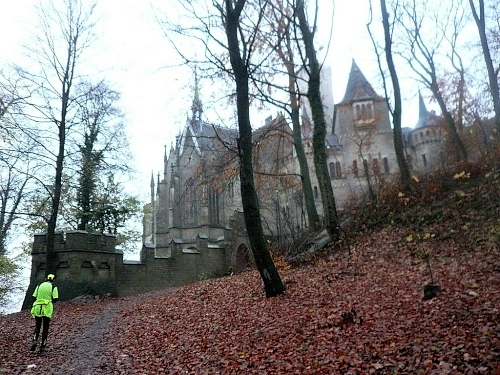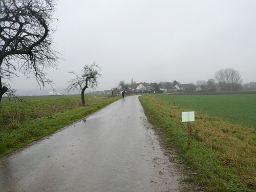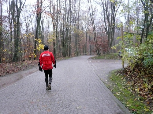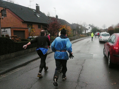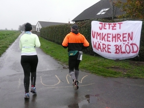 Ein Zwei-Runden-Lauf ist niemals langweilig, weil man auch als langsamer Läufer nicht alles erfassen und aufnehmen kann und deshalb auf der zweiten Runde immer wieder Neues entdeckt. Es geht wieder in den Wald, wo die Wege noch rutschiger sind und jedem Trailer einen Jubelschrei entlocken würden. Nicht ganz so den Marathonis, denn im Nu landen Helmut und Peter im Matsch. Passiert ist nichts.