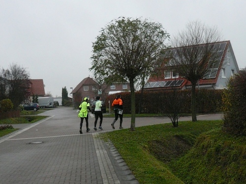 Hinterm Km-Schild 9 überqueren wir wieder die B3 und kommen nach einem weiteren Kilometer zurück nach Adensen. An der Sporthalle haben wir das erste Viertel des Marathons geschafft. Die Staffelläufer haben hier ihren 1. Wechsel.