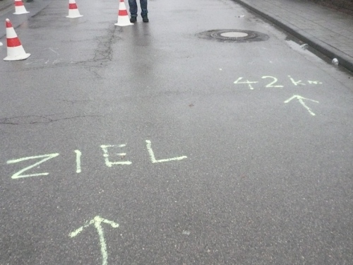 Ins Ziel kamen heute: 176 MarathonläuferInnen, 180 Halbmarathonis, 13 Partner-Marathonis 19 Marathon-Staffeln. Der junge Mann mit der Startnummer 1 ist Heiners Sohn, der unter 4 Stunden ins Ziel kam.