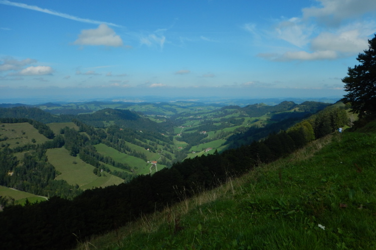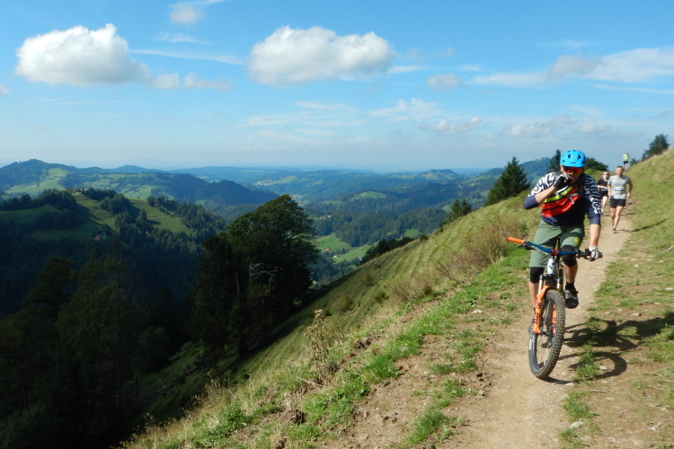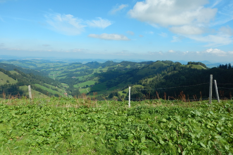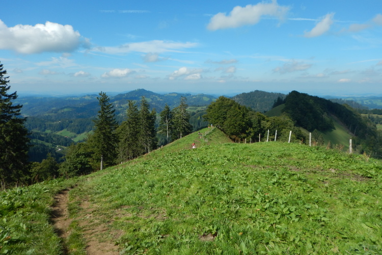 Kaum ist der erste Kilometer in den Beinen, eröffnet sich der Blick über die hügelige Landschaft, der an diesem Nachmittag zu meinem stetig wiederkehrenden Begleiter wird. Zur Erholung von den Anfangsstrapazen können wir es nun auch rollen lassen. Bis kurz vor dem Ende des vierten Kilometers geht es wieder auf die Ausgangshöhe zurück. Doch dann gibt es für die Anzeigen auf den mitgetragenen Höhenmessern nur eine Richtung: nach oben.