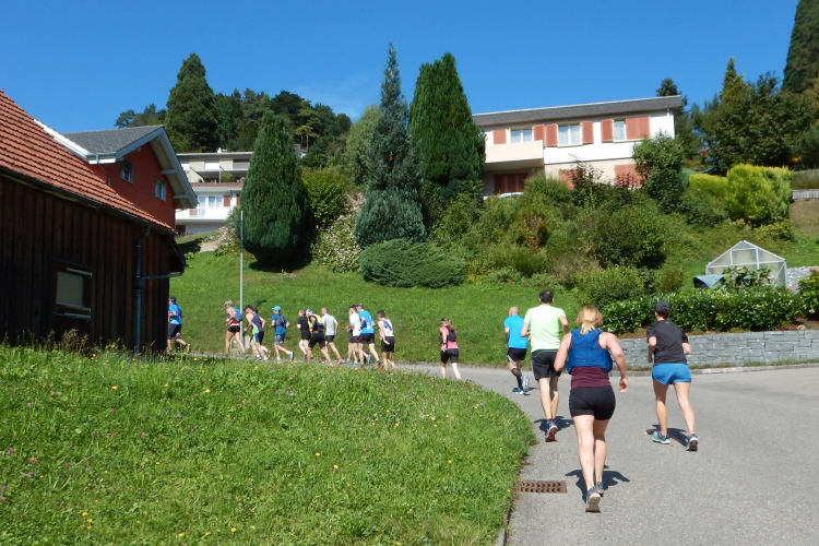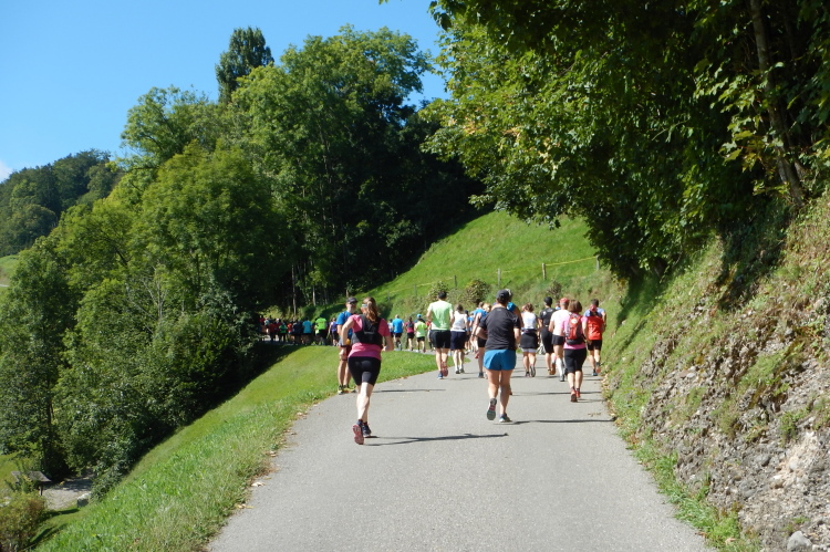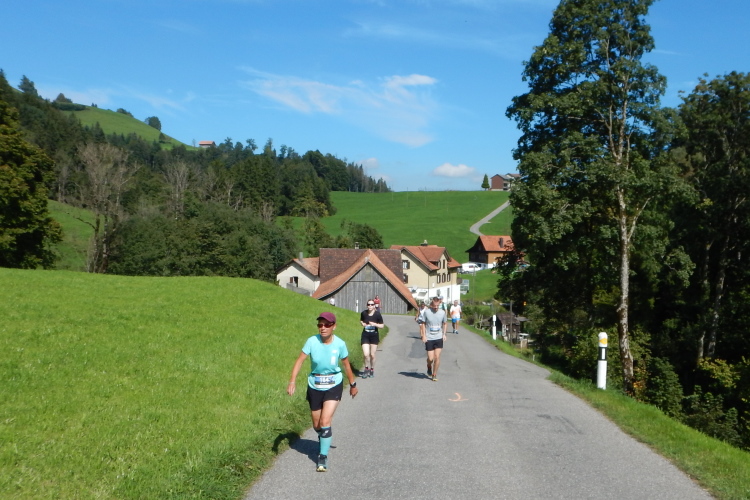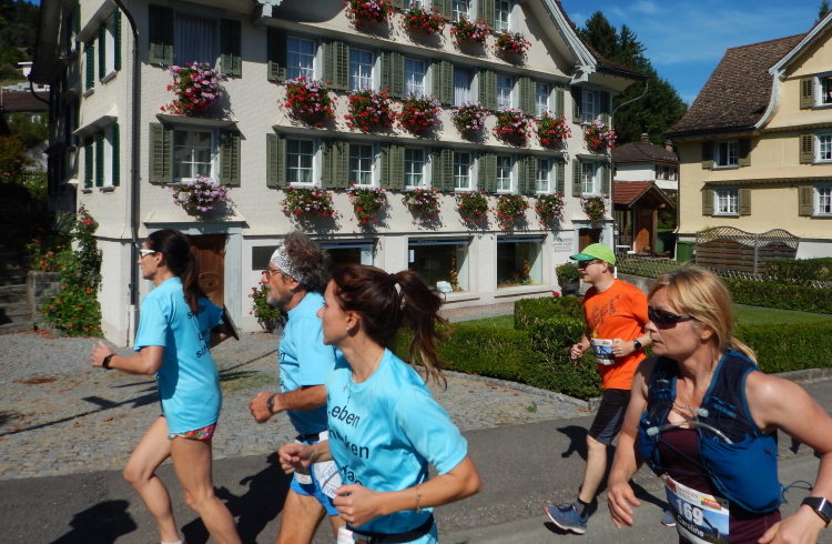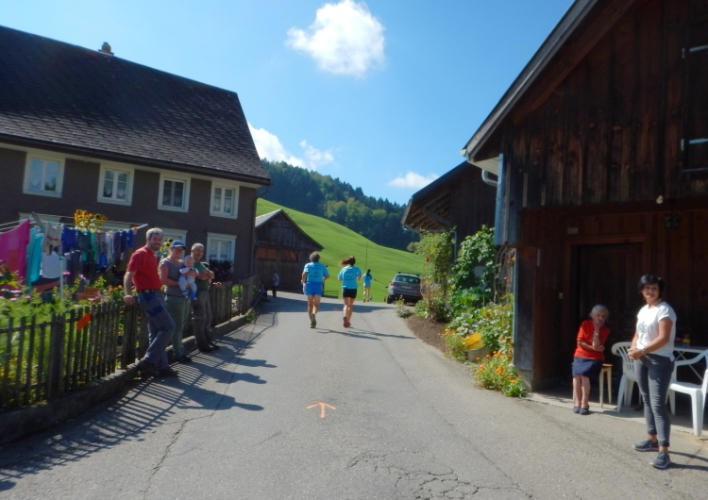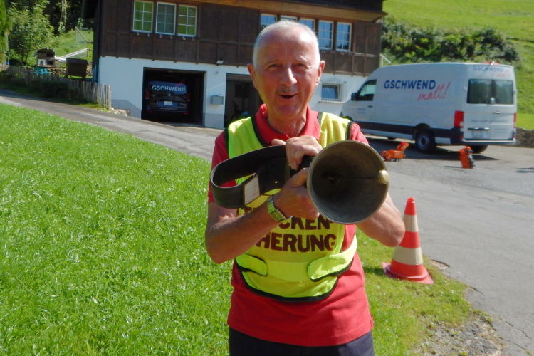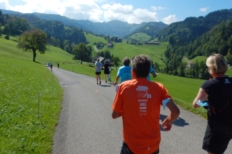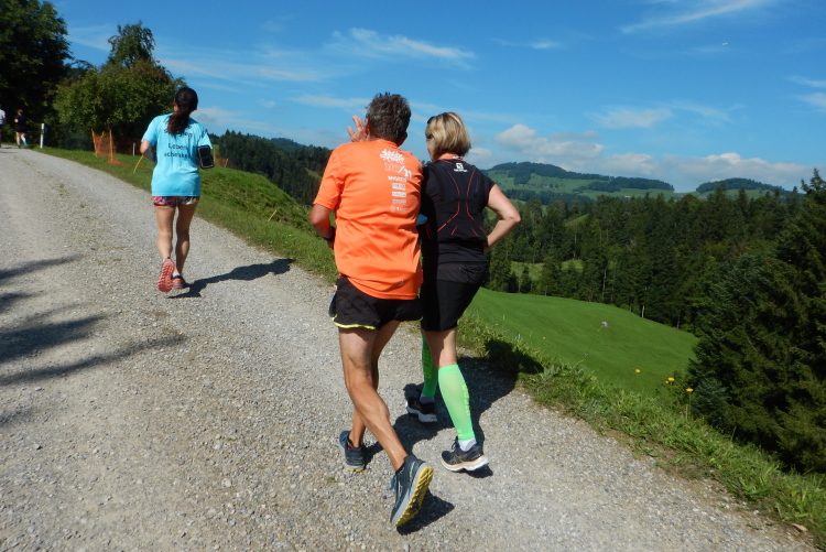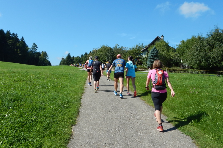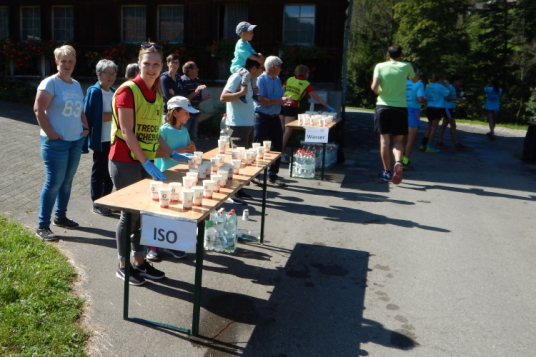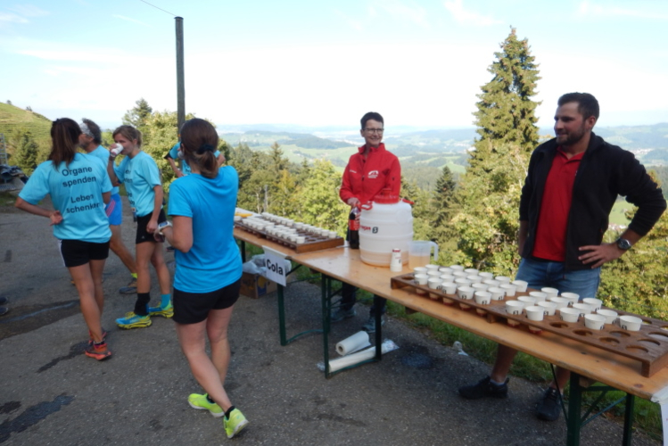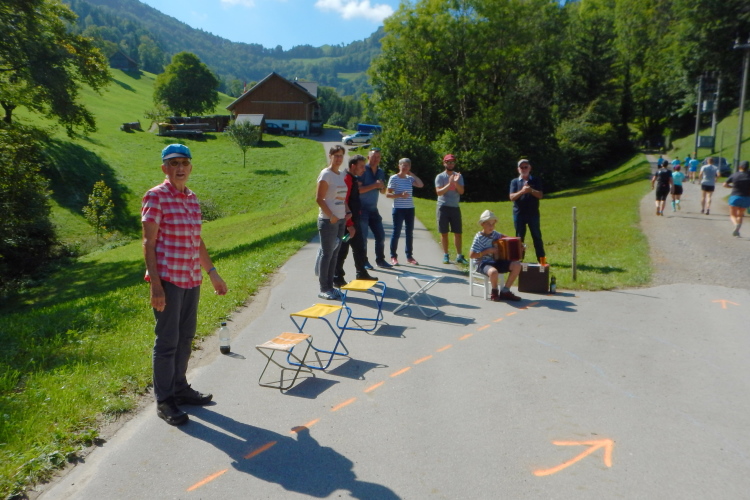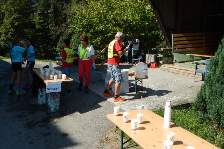 Bei den angenehmen spätsommerlichen Verhältnissen schlägt sich das in Form zahlreicher Schweißtropfen nieder, doch was den Flüssigkeitsnachschub betrifft, kümmert man sich kurz nach dem fünften Kilometer darum. Iso und Wasser werden mit musikalischer Unterstützung von drei Alphörnern gereicht.