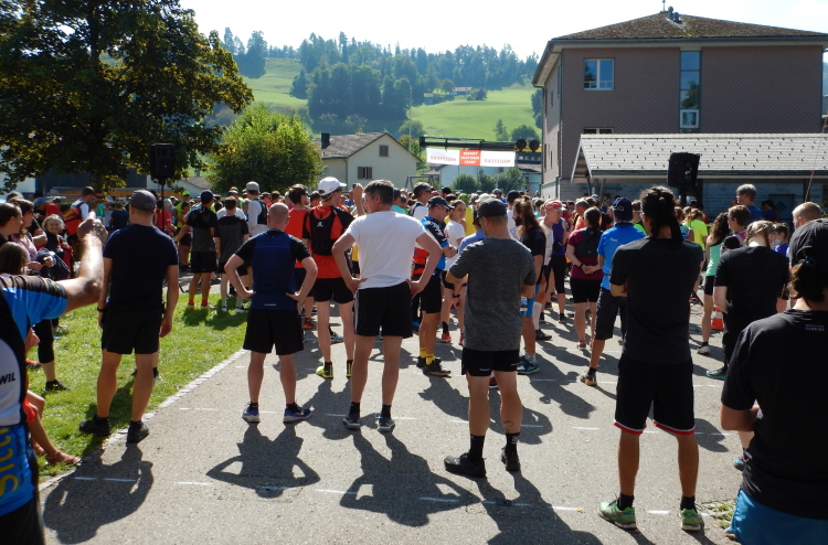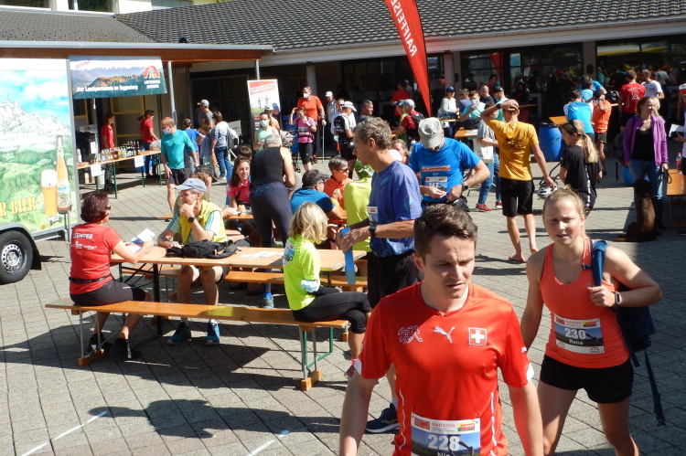 Von der zum Parkplatz umfunktionierten Wiese ist es nur ein kurzer Weg zum Schulhaus, das als Wettkampfzentrum dient. Die Rahmenbedingungen sind so, dass die zu beachtenden Schutzmaßnahmen nur einen marginalen Eingriff in die gewohnten Abläufe einer Laufveranstaltung bedeuten. Im Innern des Gebäudes, also für die Anmeldung, das Abholen der Startnummer und den Gang zum Klo ist das Tragen einer Maske erforderlich. Im Außenbereich gibt es keine spürbaren Einschränkungen.