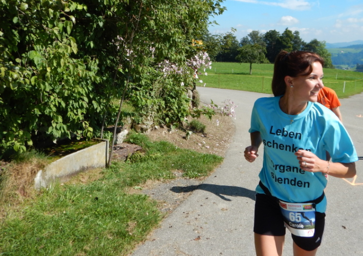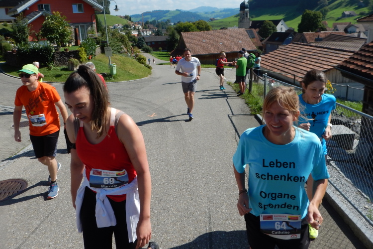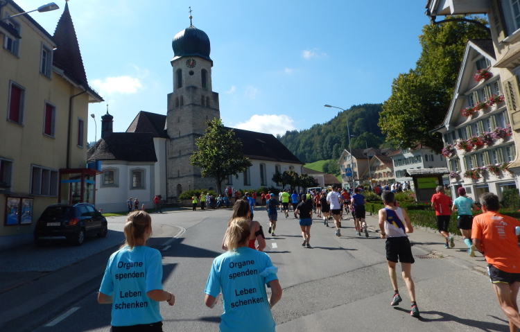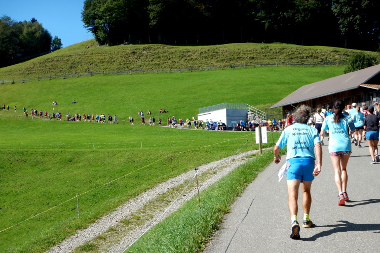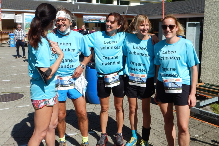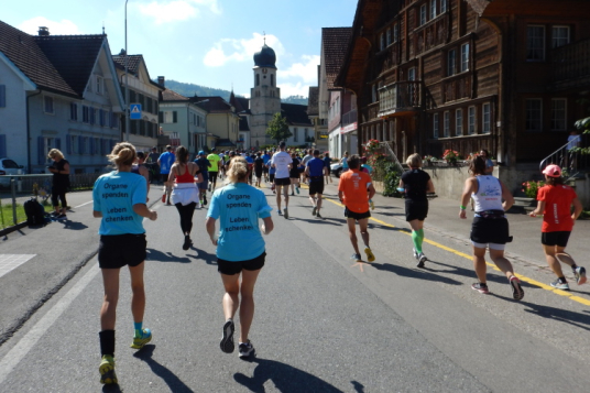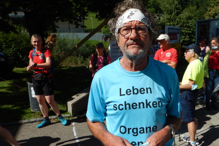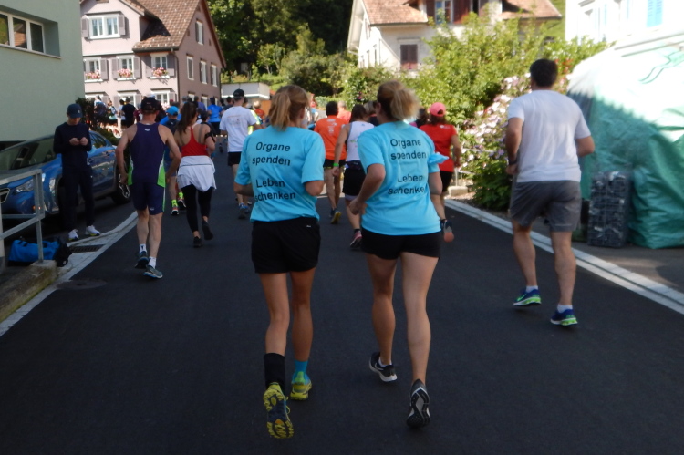 Um mich herum eine Gruppe, welche mir vor dem Start schon aufgefallen ist. Sie alle tragen Shirts mit dem Aufdruck „Leben schenken - Organe spenden“. Kopf und einziger Mann der Gruppe ist Mathias Zahner, der mir seine ihn begleitende Tochter vorstellt. Fünf Jahre alt war sie, als ihm sein Leben durch eine Lebertransplantation zum zweiten Mal geschenkt wurde. Seine Dankbarkeit ist für ihn Verpflichtung, nebst anderen Aktivitäten für die Sache bei Marathons und anderen Läufen auf das Thema Organspende aufmerksam zu machen.