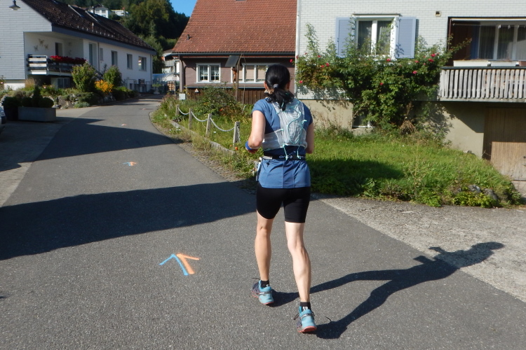 Vor dem Start ergeht noch der gute Rat an die Teilnehmer, es auf dem ersten Kilometer langsam angehen zu lassen. In der Tat könnte man da unnötig Körner wegschmeißen und gleich zu Beginn den Anblick schöner alter Häuser verpassen. Auf geteerter Straße geht es vorerst weg vom Dorf und vor allem hoch.
