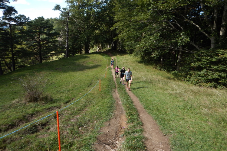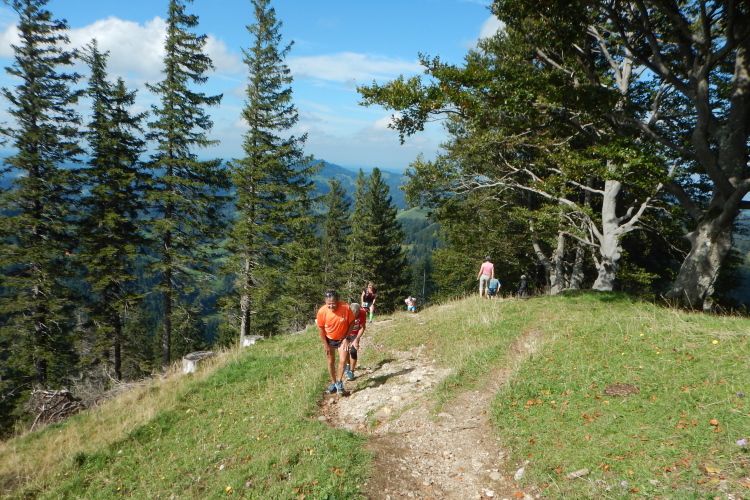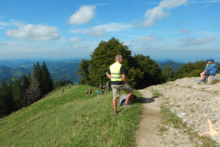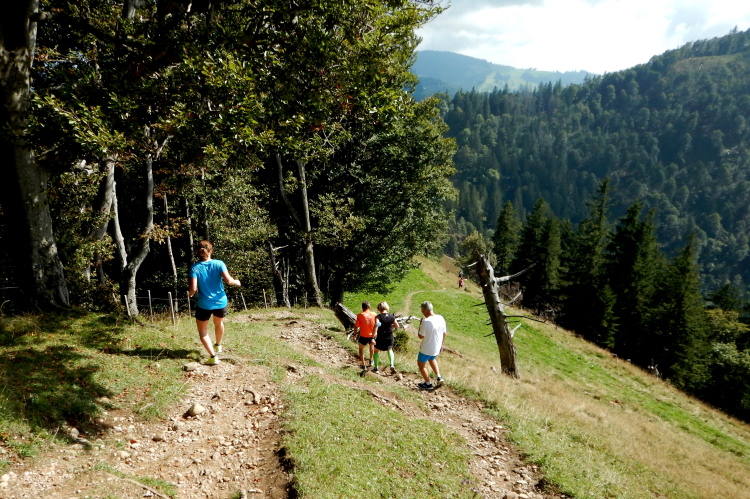 In Unkenntnis der Streckenbeschaffung und in Anbetracht der fehlenden Trailroutine und den in unterschiedlicher Stärke immer wieder auftretenden Sehproblemen auf einem Auge, habe ich die Stöcke dabei. Bei dem steilen Abstieg vom Gipfel geben sie mir Sicherheit und lasten sie für die schlecht trainierte Oberschenkelmuskulatur gute Unterstützungsdienste. Da nehme ich gerne in Kauf, dass ich sie auch dann dabeihabe, wenn ich sie nicht brauche.