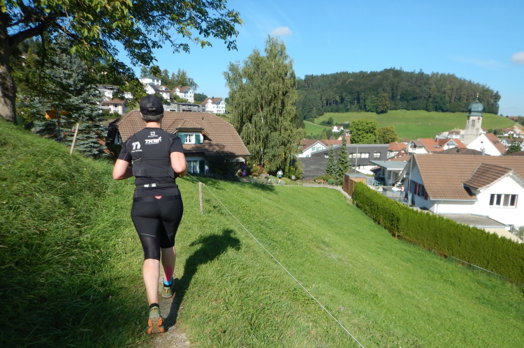 Kurz vor Mosnang gibt es einen Streckenabschnitt, der nur anlässlich des Panoramatrails belaufen werden darf und über privates Wiesland führt. Einen Kilometer vor dem Ziel hat sich das Grummeln im Gedärm wieder gelegt und ich kann wieder in einen sanften Laufschritt wechseln. Dann teilt mir ich die Kirchturmuhr mit, dass ich die Marke von drei Stunden erreicht habe. und ich bilde mir ein, dass das nun einsetzende Glockengeläut meinem baldigen Zieleinlauf gilt. Besser als dem Abgesang aus dem Leben…