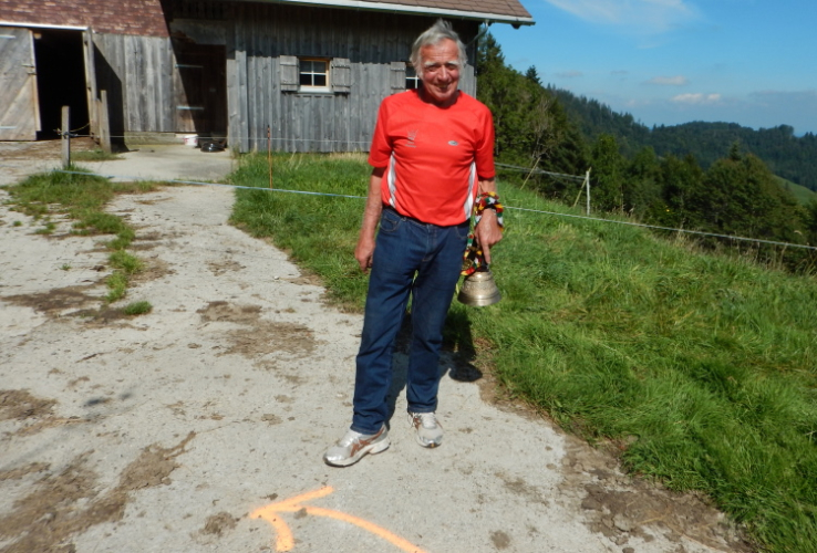 Viereinhalb Kilometer vor und zweihundert Höhenmeter über dem Ziel steht bei einem Bauernhof der dritte und letzte Verpflegungsposten. Ich fühle mich ziemlich ausgetrocknet und greife zu. Hans betont, dass er erst in einem halben Jahr den Achtzigsten feiere – und macht sich nach dem Schnappschuss auf und davon.
