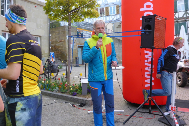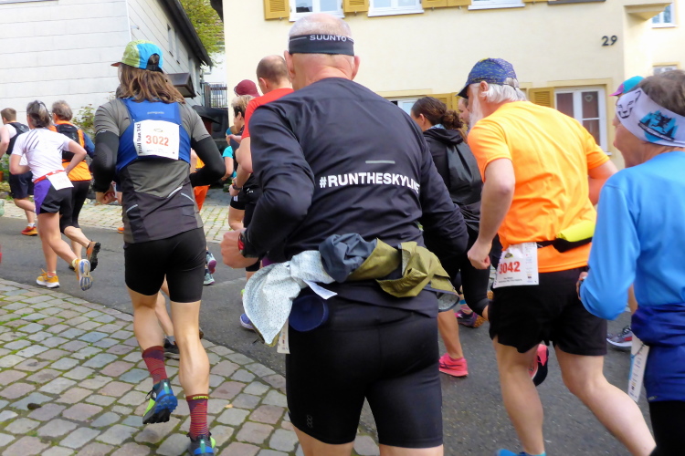 Ein Abgeordneter des Hauptsponsors Kreissparkasse spricht vor dem Countdown noch ein paar Worte. Pünktlich um 9 Uhr ertönt dann der Startschuss. Von Publikum flankiert geht es zunächst in moderatem Tempo durch die Altstadt, tendenziell bergauf. Das Kopfsteinpflaster ist gewöhnungsbedürftig, aber alle schaffen es unfallfrei.