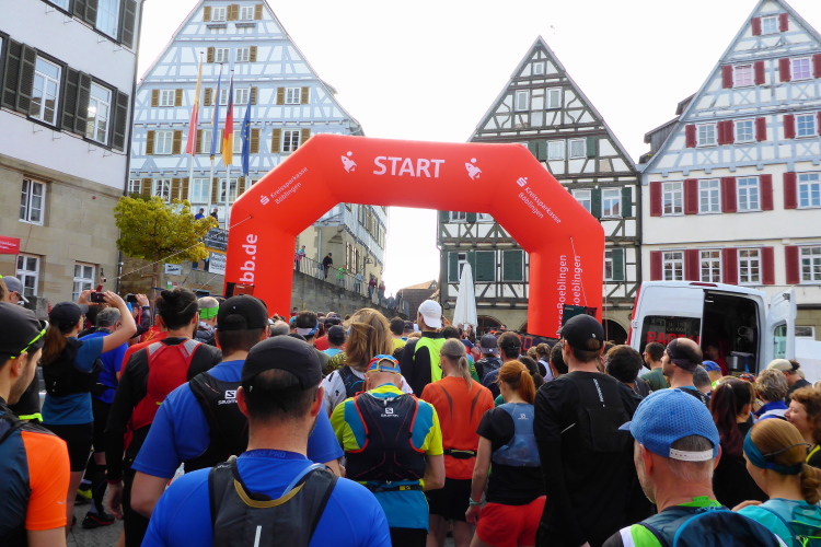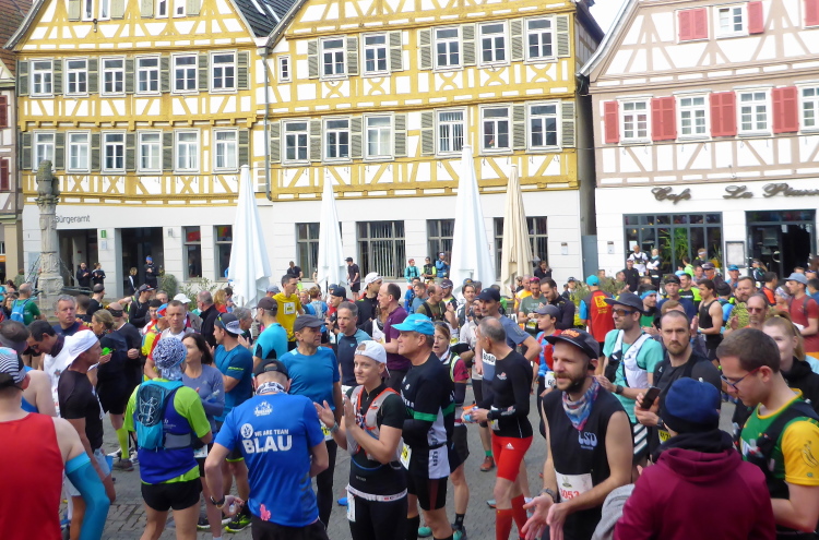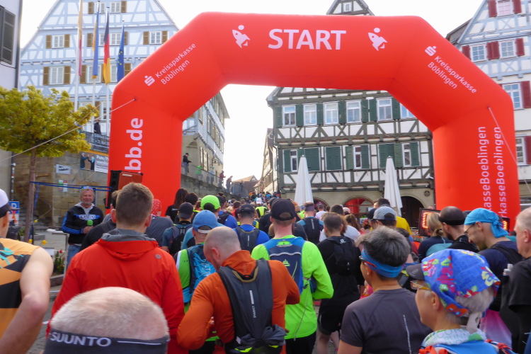 Die 5 Minuten Fußweg zum Marktplatz sind für Norbert und mich bereits der erste Höhepunkt: Er führt durch die Fußgängerzone mit schönen, alten, denkmalgeschützten Fachwerkhäusern. Durch die morgendliche Stille klingen die getragenen Melodien der Herrenberger Turmbläser vom Turm der Stiftskirche. Die Turmbläser oder Zinkenisten wurden erstmals 1457 urkundlich erwähnt. Auch auf dem Marktplatz lauschen Läufer und Schaulustige andächtig dem Vortrag der Musiker. Was für ein perfekter Moment!