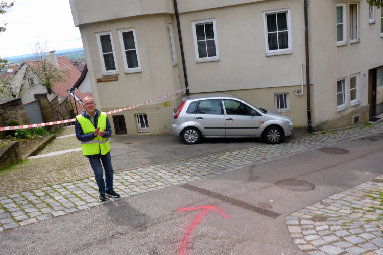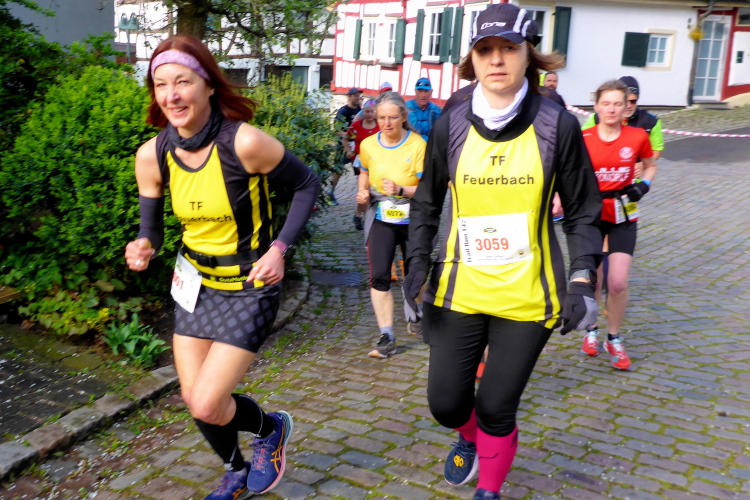 Vor uns bildet sich bereits ein Stau. Wir schälen uns durch ein enges Steintor, anschließend geht es scharf links auf die lange Treppe den Schlossberg hinauf. Nur zu zweit nebeneinander kann man hier aufsteigen. Auf dem Jerg Ratgeb Skulpturenpfad passieren wir die Stiftskirche. Immer wieder sitzen Zuschauer auf den angrenzenden Mäuerchen und feuern uns an. Auch untereinander ist die Stimmung ausgelassen, flotte Aufmunterungen machen die Runde.