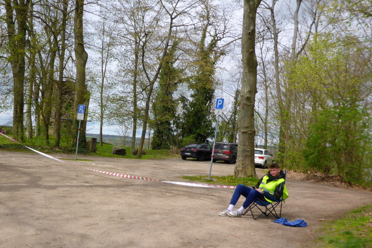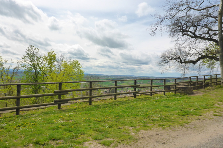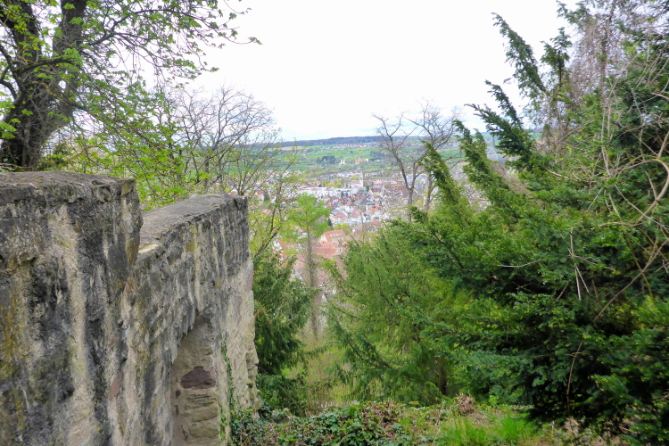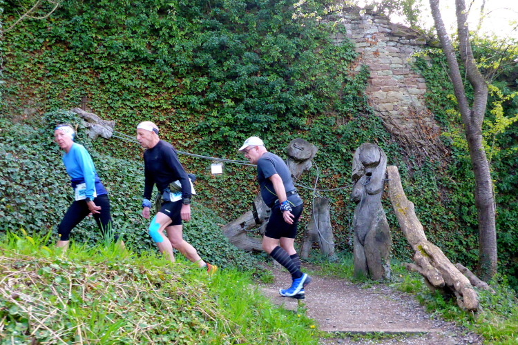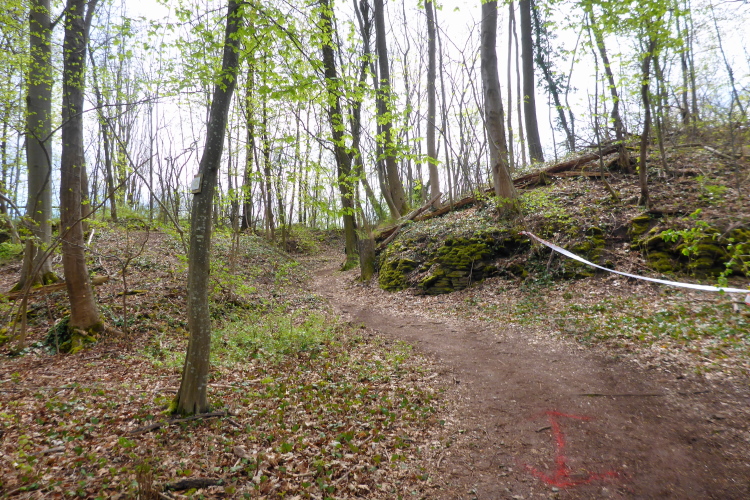 Eine letzte steile Treppe, der Gipfels des Schlossberges mit 522 Hm ist erreicht. Wir lassen die Ruine des Schlosses hinter uns und überqueren einen kleinen Rasenplatz mit toller Aussicht. Nach ein paar hundert Metern auf Asphalt weisen Pfeile über eine Wiese, dann einen schönen Wanderweg und wieder auf Asphalt. Auf dieser Strecke kommen wir am Ende auch wieder zurück. Ungefähr bei km 3 weisen uns Streckenposten scharf rechts über einen Graben. Dort gelangen wir auf den ersten Trail.