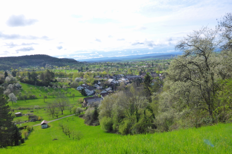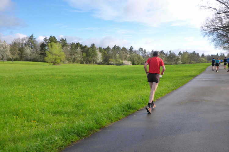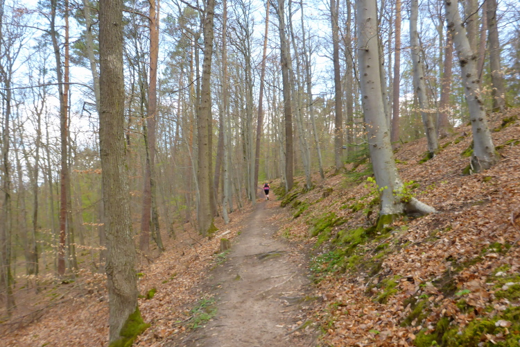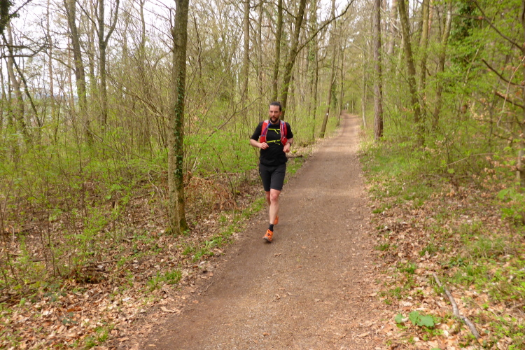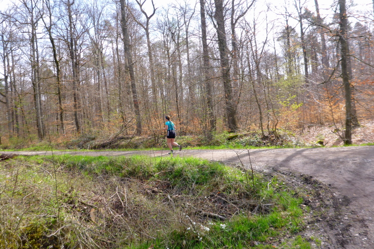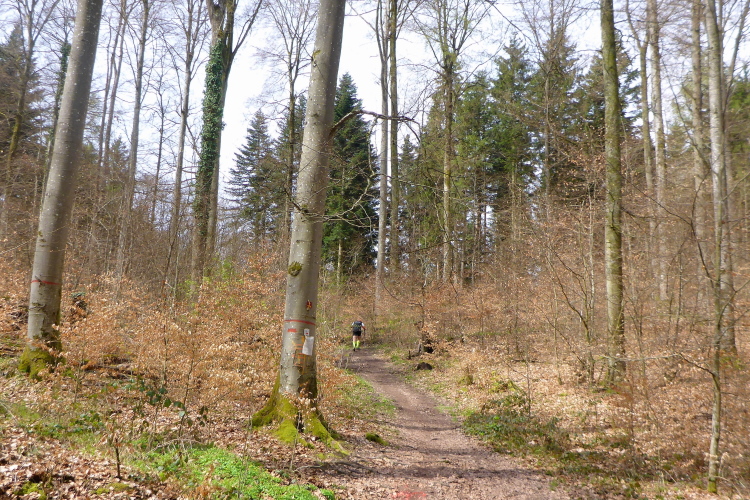 Bei km 13 verlassen wir den Wald. Hier sieht man in der Ferne zwischen grünen Feldern Gärtringen liegen. Irgendwo dort rauscht auch die stark befahrenen A81, als Kontrastprogramm zum Paradies, in dem wir uns gerade befinden. Nach 500 Metern biegen wir erneut in den Wald. Dieser hat sich jedoch verändert, ein schmaler Pfad schlängelt sich durch dichten Buchenforst. Das kräftige Grün der aufspringenden Blattknospen leuchtet im Sonnenlicht. Matsch und große Pfützen deuten auf sumpfiges Gelände hin.