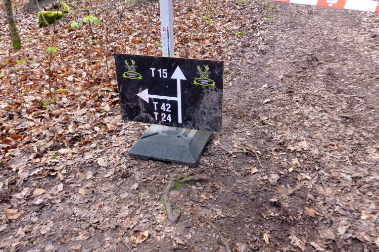 Obwohl der Trail nun wellig weiterführt, geht es tendenziell immer noch bergauf. Bei km 7 erreichen wir die Streckentrennung von T15 und T24. Für uns geht es rechts den Berg wieder hinunter auf einen abwechslungsreichen, welligen Singletrail. Auf einmal wird der Weg ziemlich nass und wir müssen unsere Füße vorsichtig setzen. Ein Fußbad im Schlamm wäre nicht so angenehm.