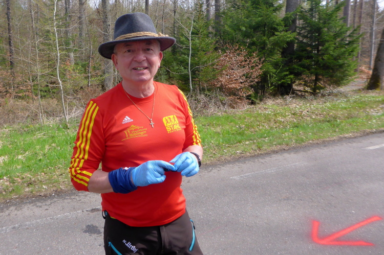 Norbert und ich packen unsere Jacken in eine vorbereitete Tasche und geben sie am Stand bei Karen Stahl ab, die Spannung steigt. Axel Stahl gibt noch letzte Hinweise zur Strecke (es soll richtig matschig werden) und den Markierungen (Pfeile und Flatterband). Zu guter Letzt gibt es noch den Tipp des Tages:„Immer dem Führenden hinterher, und kurz vor dem Ziel überholen.“