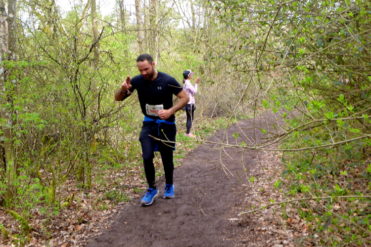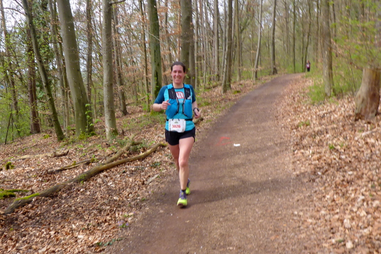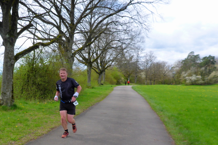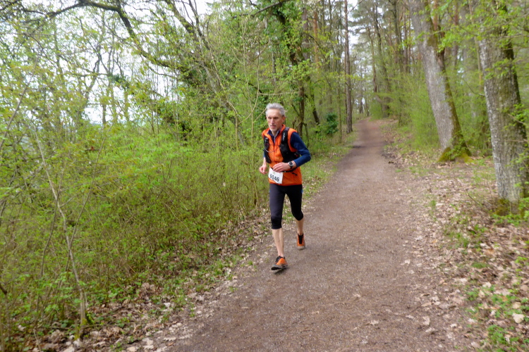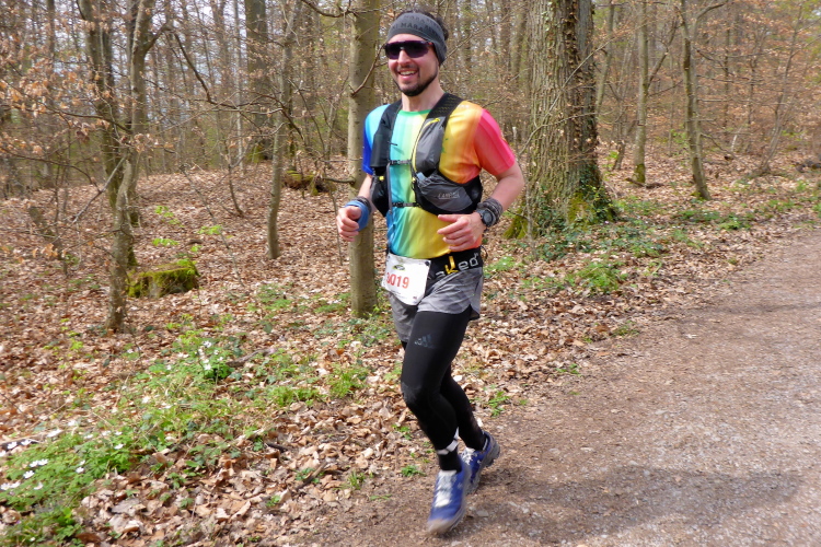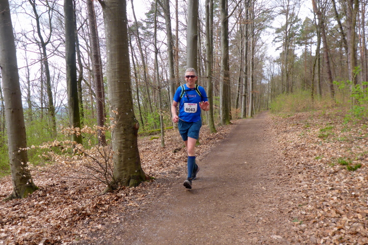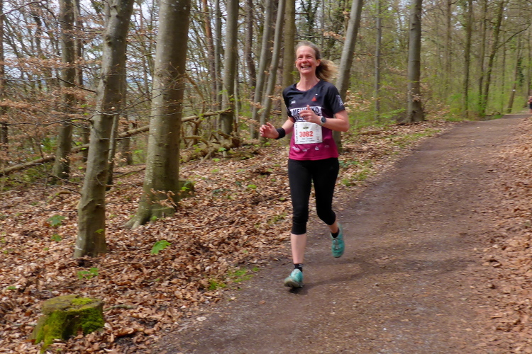 Ich bin ganz in meinem Element, denn gerade im Frühling gibt es im Wald einiges zu entdecken. Buschwindröschen und Schlüsselblumen sind hier nur die auffälligsten Blüten. Das Laufen auf den schmalen Pfaden ist für mich das Schönste. Ungefähr bei km 9 kommt die nächste VP. Es gibt Hefezopf, Früchteriegel, Bananen, Tee, Iso, Wasser und sogar Bier. Dazu viel gute Laune von den Helfern. Das passt gut zu meiner eigenen frohen Stimmung.