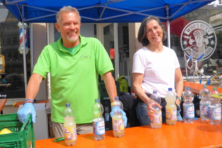 Noch eine letzte Kurve, das Ziel ist da. Ich bekomme Glückwünsche und eine besondere Medaille aus Holz. Norbert wartet an der Zielverpflegung und wir freuen uns über den gelungenen Lauf.