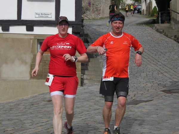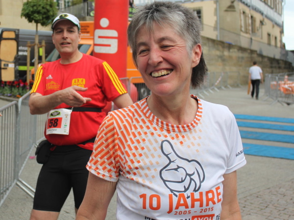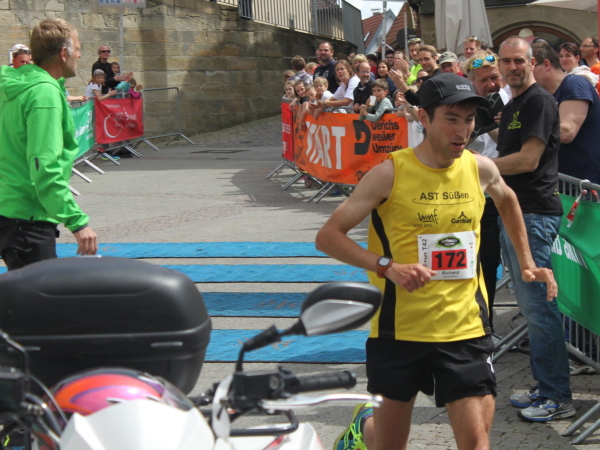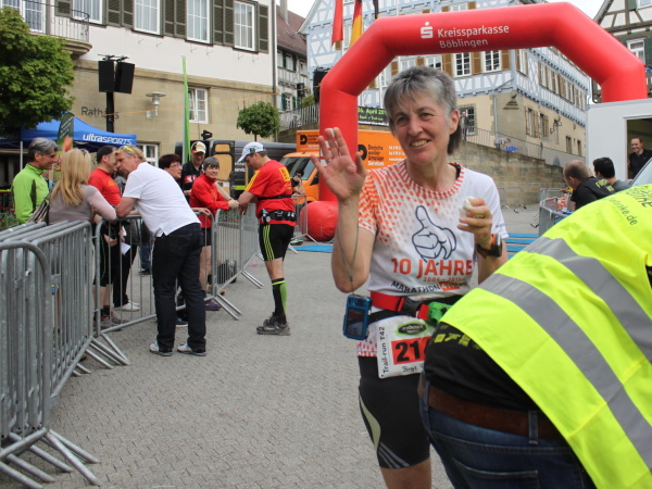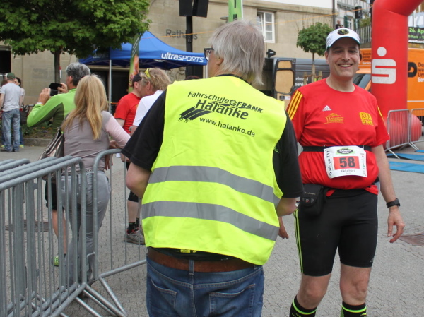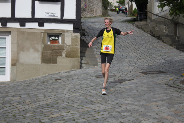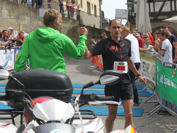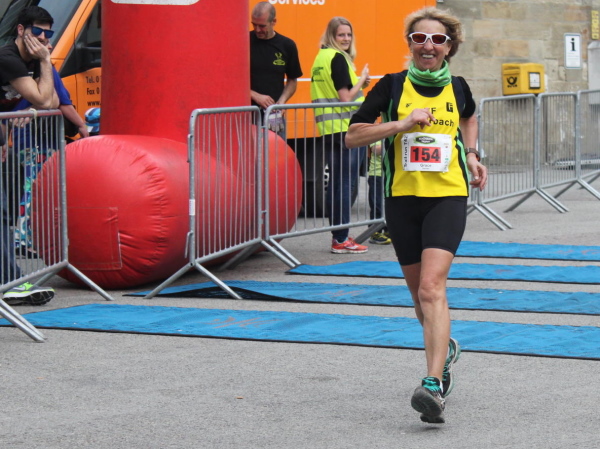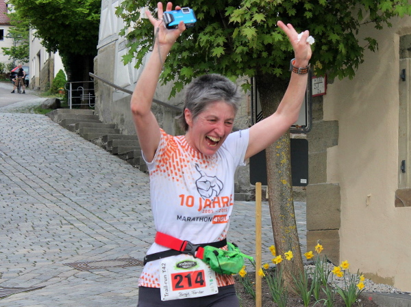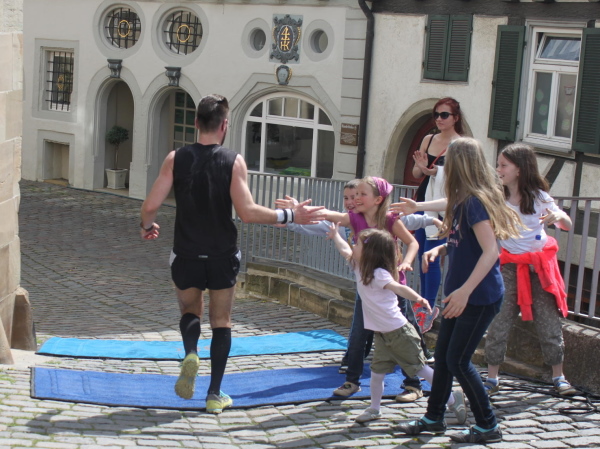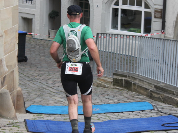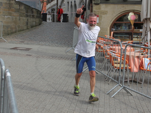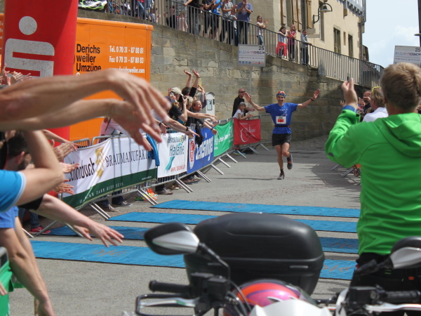 Schnell verliere ich an Höhe und finde mich von einigen Schaulustigen angefeuert auf einer steilen Kopfsteinpflasterstraße wieder. Hier heißt es gut die Füße heben und locker hinunter joggen. Ich höre schon meinen Fanclub mit Anja, Kati, Bernie und Greppi, die bereits gefinsht haben. So einen Empfang mit LaOlaWelle bekomme ich sonst eher selten. Norbert läuft schon ins Ziel, um mich dort zu begrüßen. Für mich geht es noch um eine scharfe Kurve, dann ist der Zielbogen erreicht.