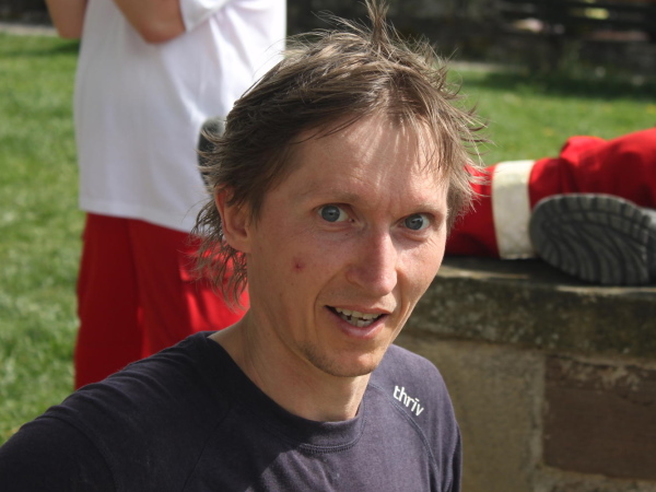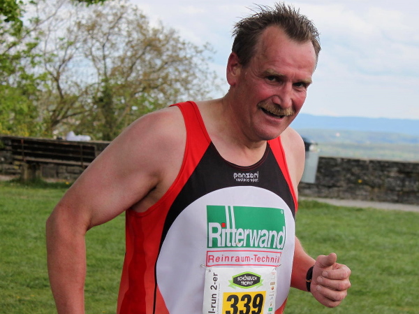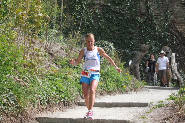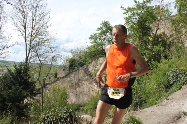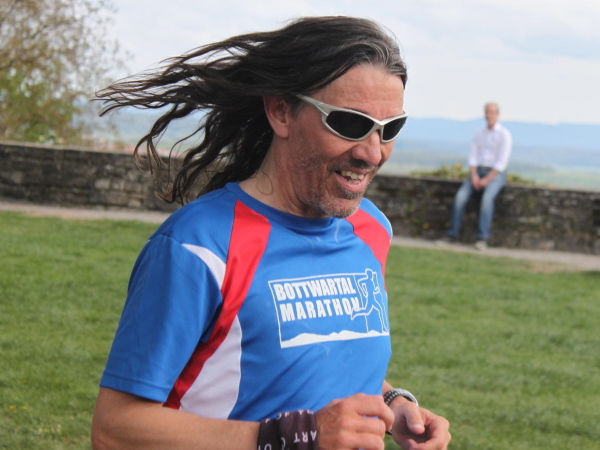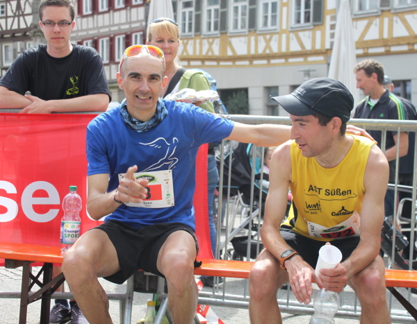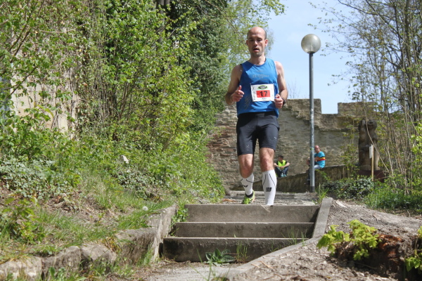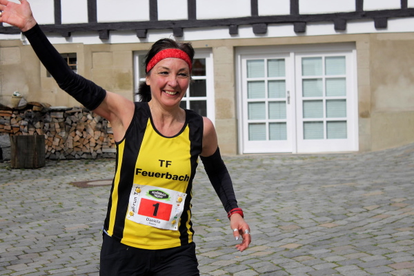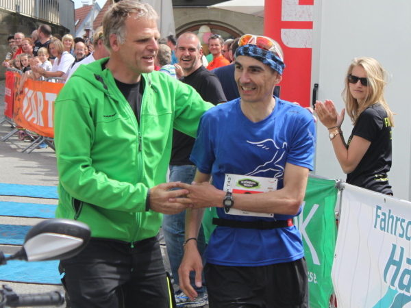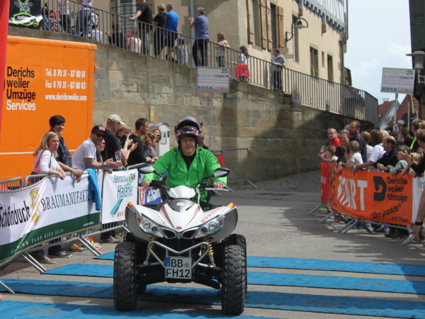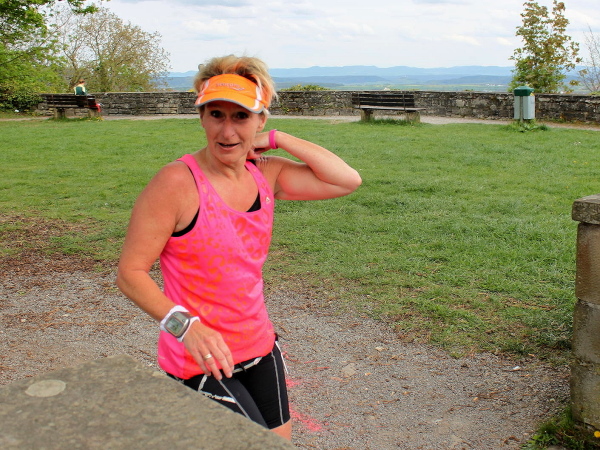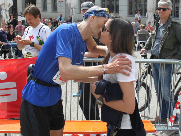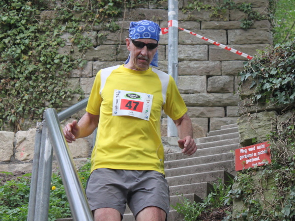 Schnell verliere ich an Höhe und finde mich von einigen Schaulustigen angefeuert auf einer steilen Kopfsteinpflasterstraße wieder. Hier heißt es gut die Füße heben und locker hinunter joggen. Ich höre schon meinen Fanclub mit Anja, Kati, Bernie und Greppi, die bereits gefinsht haben. So einen Empfang mit LaOlaWelle bekomme ich sonst eher selten. Norbert läuft schon ins Ziel, um mich dort zu begrüßen. Für mich geht es noch um eine scharfe Kurve, dann ist der Zielbogen erreicht.