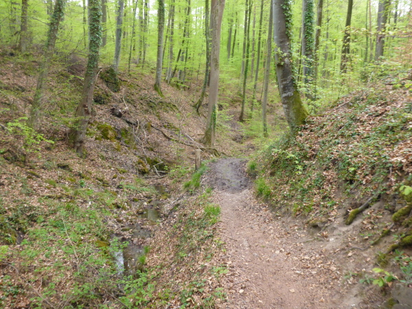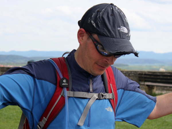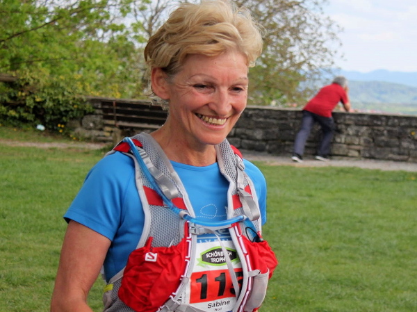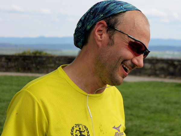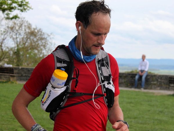 Am Stellenhäusle, einem alten Steinhaus von 1855, sichern Helfer die Straße. Nun geht es ein Stück am Waldrand entlang und dann links auf den nächsten Trail. Der Streckenposten macht mit seiner Rassel Lärm. Er hat an seinem Fahrrad ein Hinweisschild, dass es nur noch 10 km sind. Ich spüre, wie es mir langsam besser geht. Die Sonne ist verschwunden und es weht ein frischer Wind. Der Trail ist wellig und angenehm zu laufen. Die Steigungen kann ich nun wieder kraftvoller gehen und bergab läuft es sowieso. Plötzlich zeigt ein Schild links steil bergauf. Von weitem kann ich schon den Sani sehen, der oben steht und klatscht. Ich bedanke mich und er ruft mir noch gute Worte hinterher, denn es geht schon wieder bergab. Ich kann einen Läufer überholen, was mich zusätzlich motiviert.