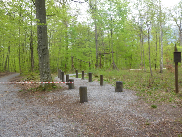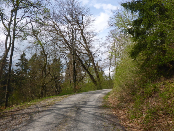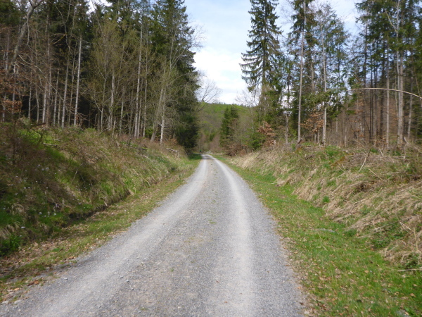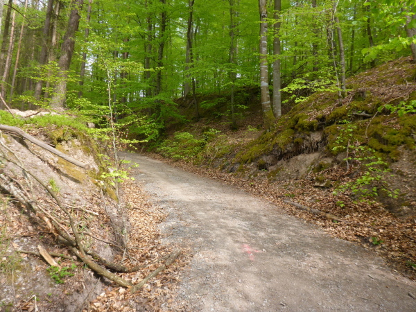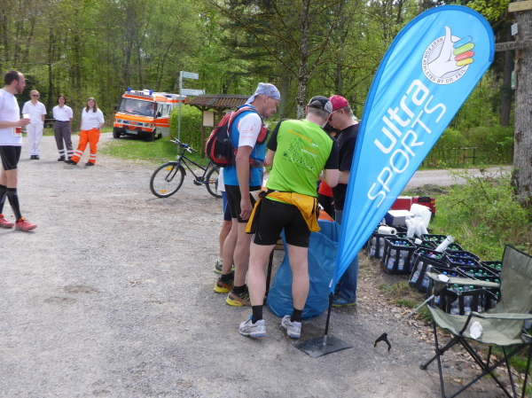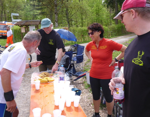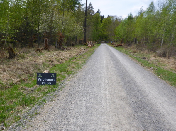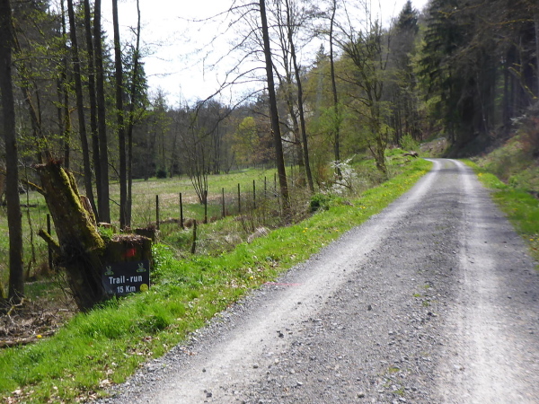 Auf dem breiten Forstweg kündigt ein Schild noch 15 km zu laufende Strecke an. Es geht zur nächsten VP. Schon von weitem werde ich klatschend begrüßt. Man fragt nach meinem Befinden. Wir halten ein kurzes Schwätzchen - das tut gut. Ich trinke wieder ausreichend, dann weisen mich die Helfer auf einen feinen Trail nach oben. Nach einem längeren Anstieg befinde ich mich dann wieder auf einem breiten Forstweg.