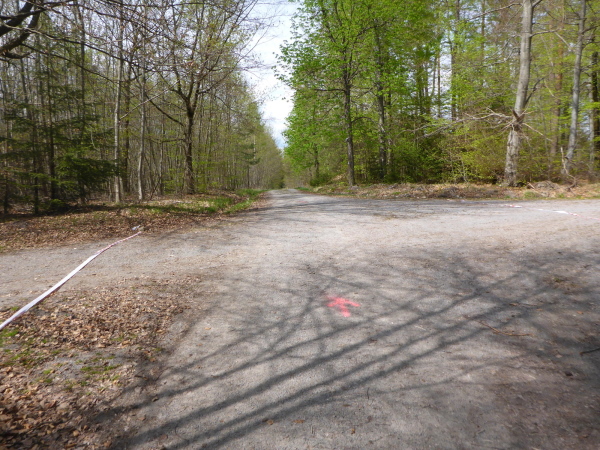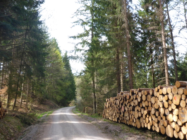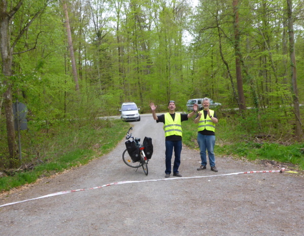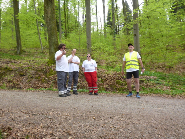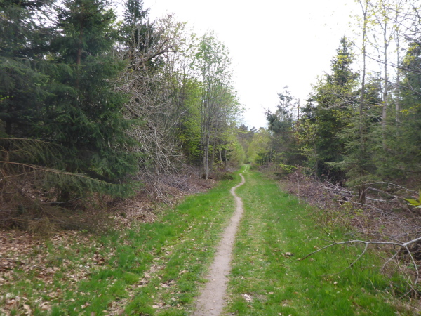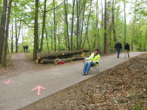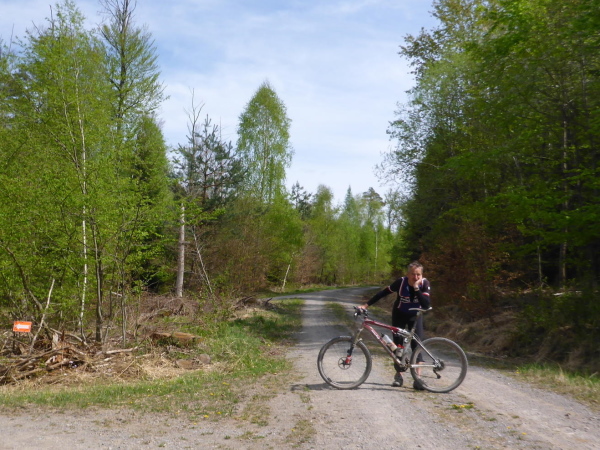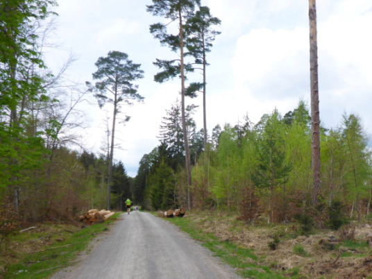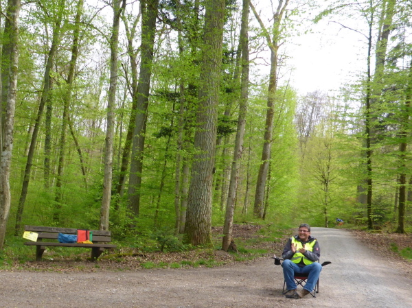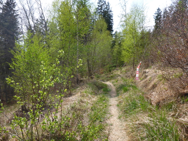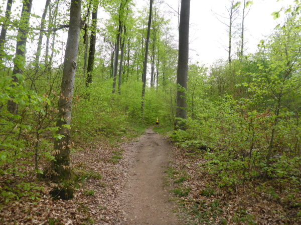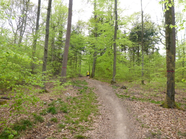 Frisch gestärkt und gut gelaunt nehme ich die letzten 7 km in Angriff. Es geht auf einem breiten Forstweg dahin. Als mir schon langweilig wird, zeigt das bekannte rote Schild nach links den Berg hinauf. Schon von weitem kann ich die gelbe Warnweste eines Helfers erkennen. Er kommt mir entgegen. „Ich hole Dich hier ab“ meint er beim Näherkommen, dreht sich um und läuft an meiner Seite mit. Er sei schon seit 4 Stunden hier und wolle sich die Strecke auch mal ansehen. Er findet es spannend, ständig neue Läufer zu sehen. So unterhalten wir uns, bis wir seinen Standplatz am Abzweig erreichen. Er wünscht mir noch „Alles Gute“ und entlässt mich auf meinen Weg.