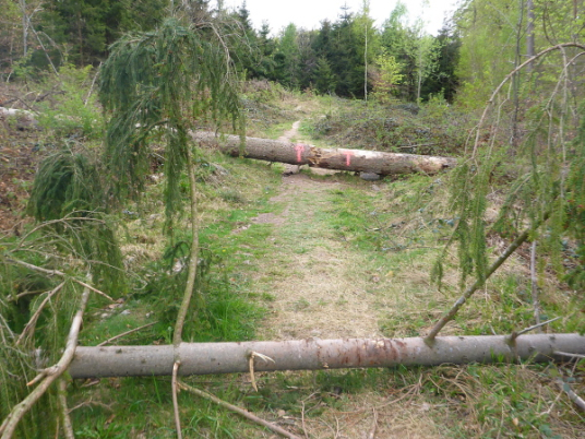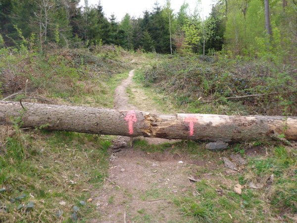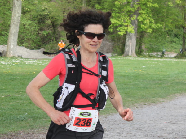 Auf dem folgenden Trail liegen plötzlich zwei Baumstämme quer über dem Weg. Eigentlich ist das ja ganz lustig. Das Problem erschließt sich mir erst, als ich vor dem einen halben Meter dicken Stamm stehe. Wie komme ich jetzt drüber? Normalerweise würde ich hoch steigen und hinten herunterspringen. Nach 36 km lassen sich meine Beine allerdings nicht mehr so einfach abwinkeln – zum Hinaufsteigen also keine Chance. Drumherum geht auch nicht. Also suche ich die niedrigste Stelle, setze mich auf den Stamm und wuchte vorsichtig die Beine auf die andere Seite. Der zweite Baumstamm ist niedriger, da komme ich besser hinüber.