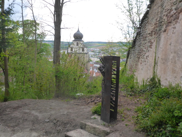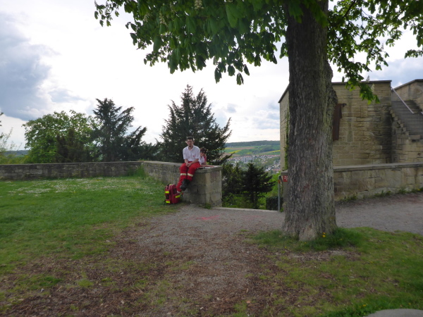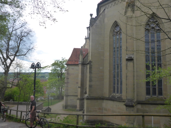 Oben meint der Helfer: „Nur noch über die Wiese und dann bergab“. Und das mache ich auch. Vor mir liegt Herrenberg in seiner ganzen Schönheit. Am Steintor warten Sanis, damit ich den Einstieg nicht verpasse. Treppen führen hinunter in die Stadt. Es sind nicht die vielen steilen Stufen vom Anstieg, wir befinden uns nämlich direkt an der markanten Herrenberger Stiftskirche. Vor 40 Jahren ist die erste gotische Hallenkirche Württembergs zu unfreiwilliger Berühmtheit gelangt: Es wurde festgestellt, dass der Schlossberg, auf dem die Kirche steht nicht stabil ist. Jährlich wandert die Kirche um einen Millimeter auf die Altstadt zu. 10 Jahre dauerte die Renovierung. In der Glockenstube der Stiftskirche befindet sich ein in Europa einmaliges Glockenmuseum: über 30 läutbare Glocken aus neun Jahrhunderten sind hier zu besichtigen und werden auch regelmäßig gespielt.